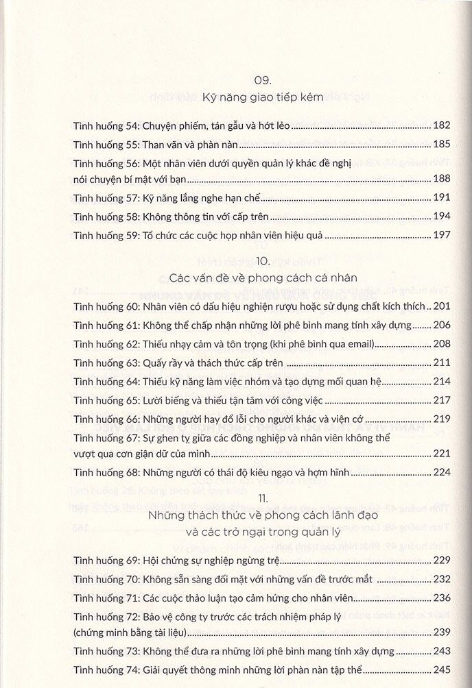 Có rất nhiều chủ đề mà các nhà lãnh đạo không thể đối thoại thoải mái với nhân viên, chẳng hạn như: thời trang, việc đi làm muộn, các vấn đề về giao tiếp và hiệu quả công việc. Cuốn sách 101 Tình Huống Nhân Sự Nan Giải sẽ mang đến cho bạn những hướng dẫn cụ thể, những cuộc hội thoại trong thực tế nhằm giúp bạn có thể đối thoại trực tiếp với nhân viên, giảm bớt sự khó khăn của vấn đề này.