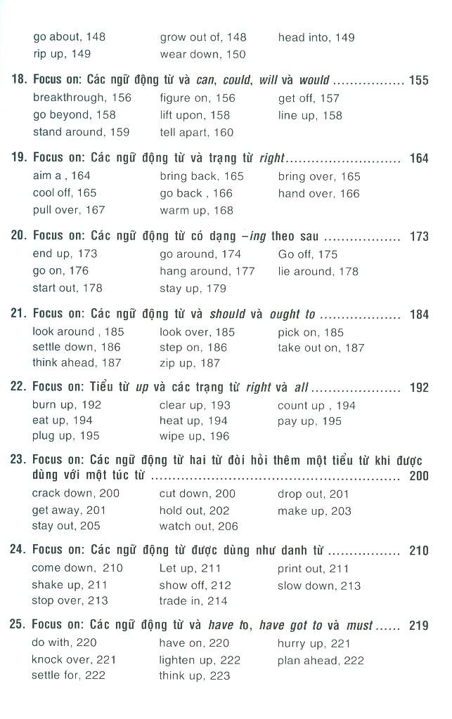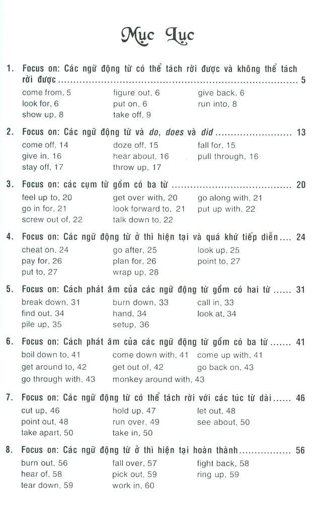 Quyển sách “3000 ngữ động từ tiếng Anh và cách dùng” này sẽ giúp bạn đọc hiểu rõ hơn về cách dùng của các ngữ động từ cũng như ý nghĩa của chúng, qua đó có thể vận dụng các ngữ động từ để giao tiếp một cách tự nhiên và hiệu quả, đặc biệt là trong các bài thi có kỹ năng nói và viết như IELTS, TOEFL, hoặc trong công việc.