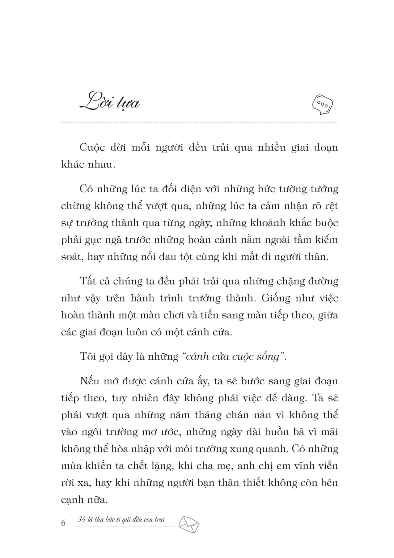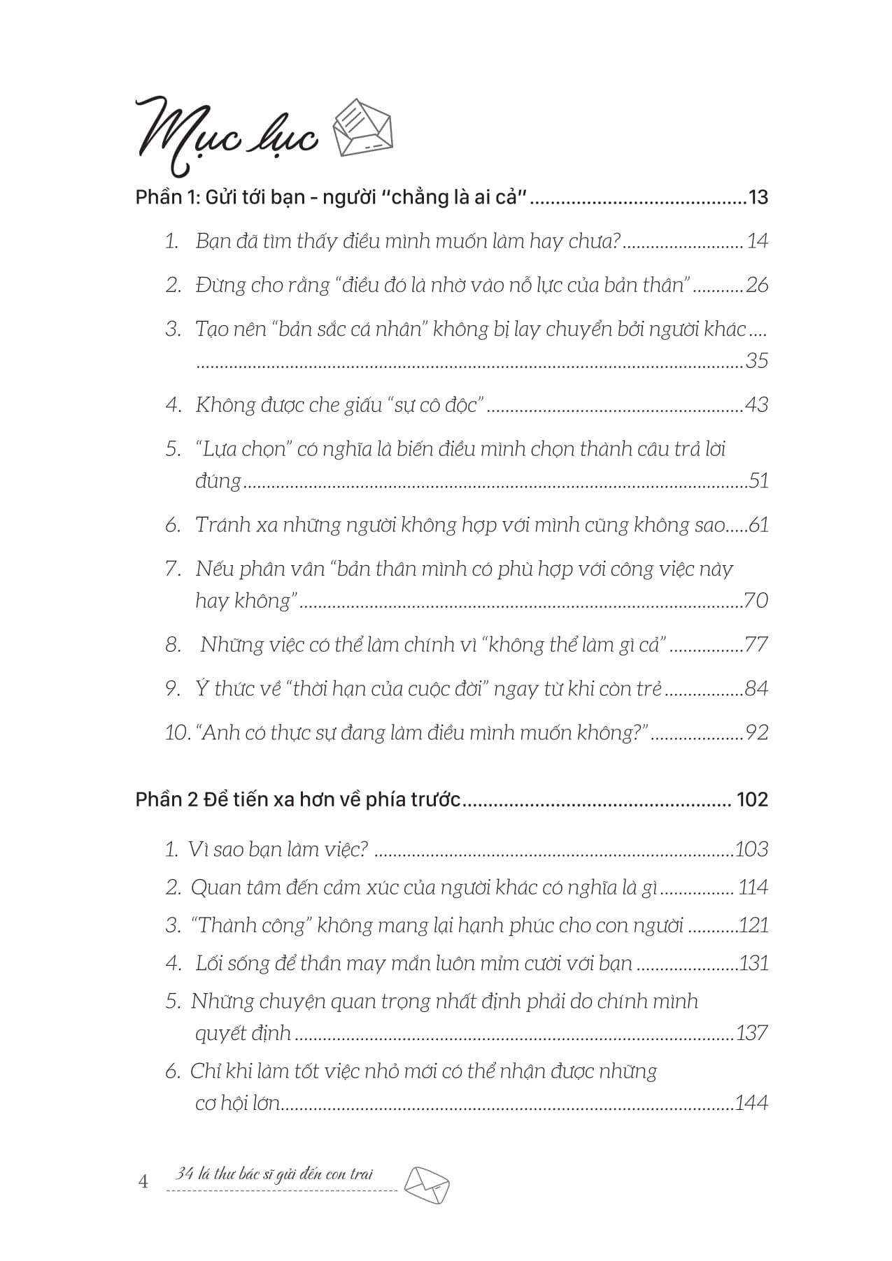 Trên đây là những điểm nổi bật của cuốn sách “34 Lá Thư Bác Sĩ Gửi Đến Con Trai” – tác phẩm truyền cảm hứng mạnh mẽ dành cho những người trẻ đang loay hoay giữa hành trình trưởng thành. Chúng tôi tin rằng, đây sẽ là món quà tinh thần ý nghĩa không chỉ cho các bạn học sinh, sinh viên mà còn cả các bậc cha mẹ đang tìm cách hiểu và kết nối với con mình.