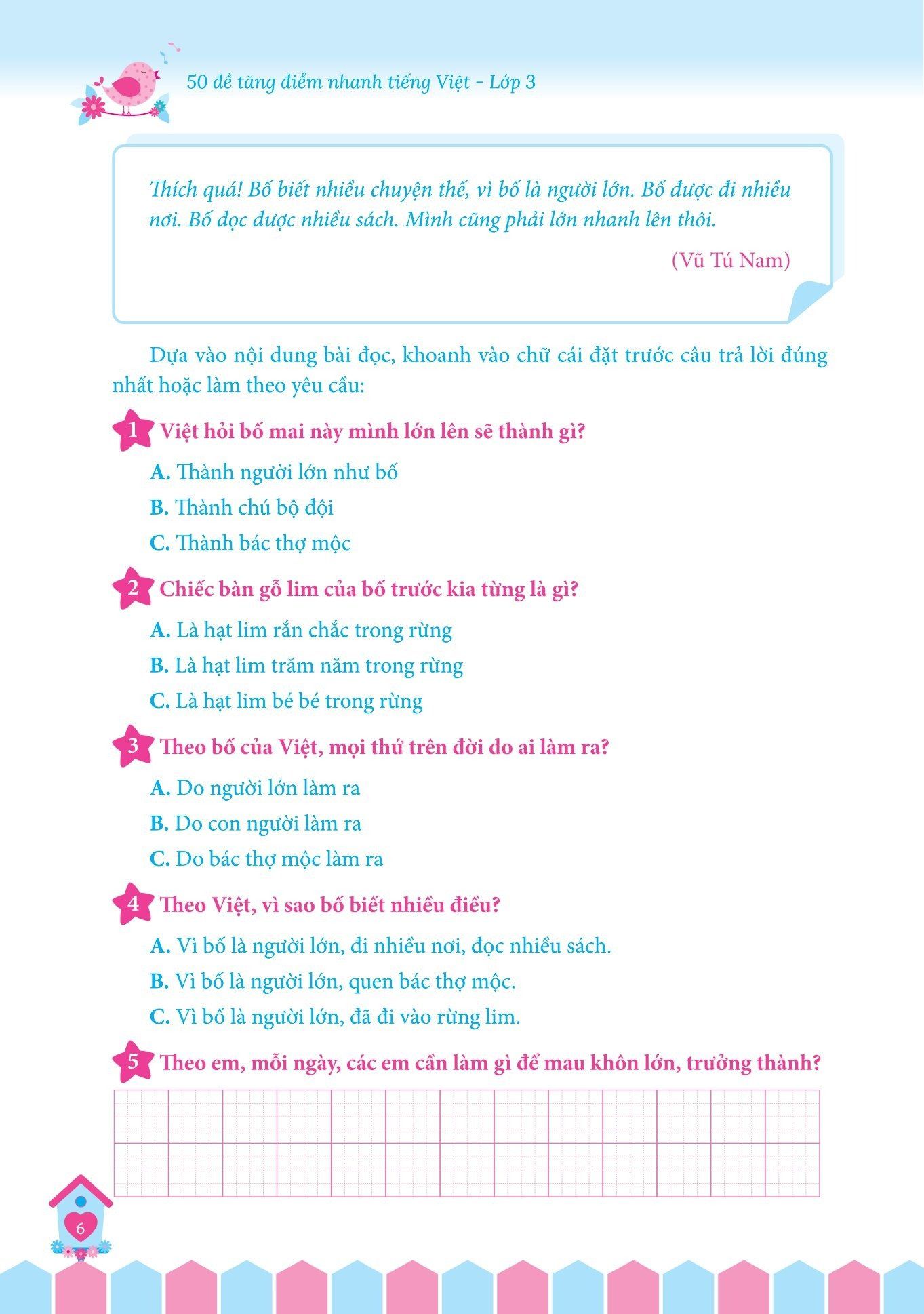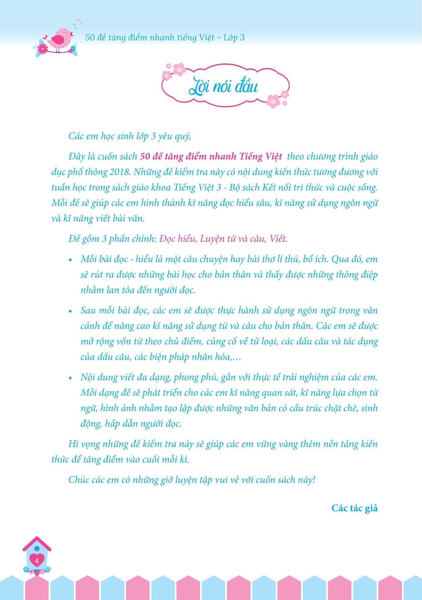 Đối với phụ huynh và giáo viên, đây là nguồn tài liệu không thể thiếu để hỗ trợ các em học sinh trong quá trình học tập và chuẩn bị cho các bài kiểm tra. Cuốn sách 50 Đề Tăng Điểm Nhanh Tiếng Việt Lớp 3 sẽ là người bạn đồng hành không thể thiếu giúp các em không chỉ thành công trong học tập mà còn trong cuộc sống.