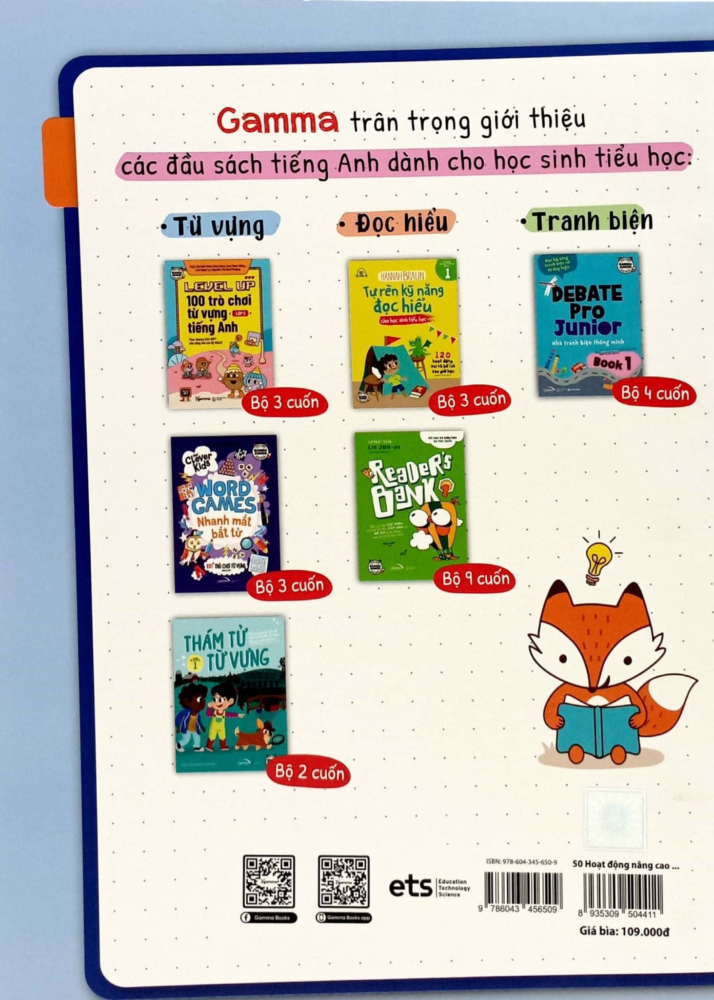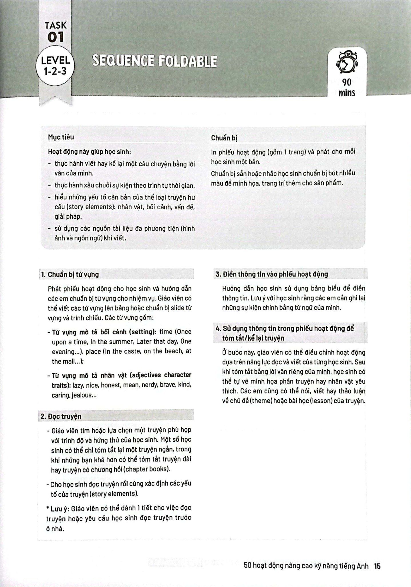 50 hoạt động nâng cao kỹ năng tiếng Anh chính là cuốn sách ra đời để lấp vào khoảng trống đó và có thể được áp dụng với nhiều chương trình học khác nhau. Sách được chia thành 4 phần lớn tương ứng với các hoạt động phát triển 4 kỹ năng tiếng Anh và bao gồm hơn 50 nhiệm vụ ngôn ngữ (Task) để trẻ thực hiện.