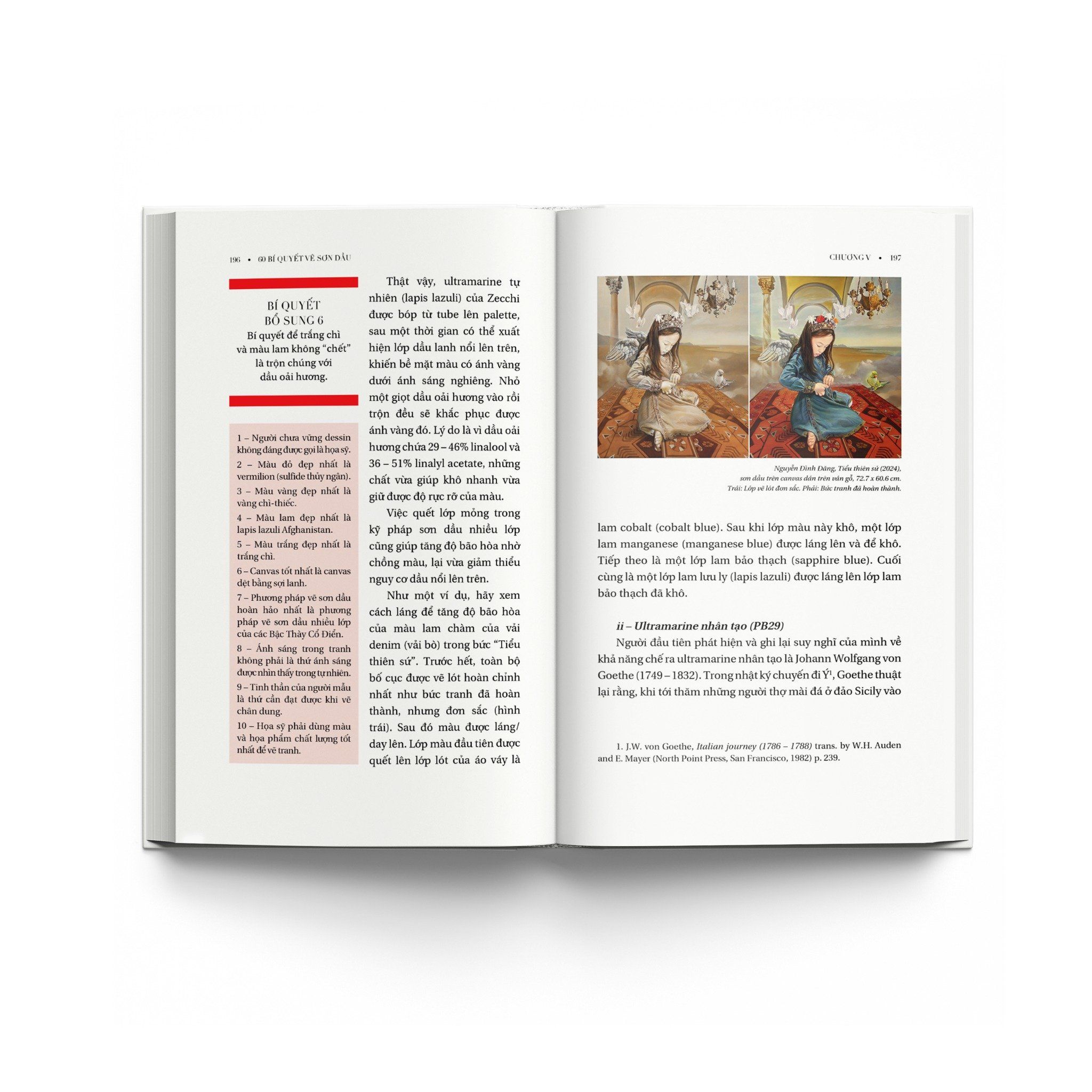 Ngoài 60 bí quyết của tác giả còn có thêm 7 bí quyết bổ sung, trong đó có bí quyết của van Eyck, Rubens, và de Mayerne. Các bí quyết được trình bày lần lượt trong phần nội dung và kèm phần chỉ mục giúp bạn đọc tiện tra cứu. “60 bí quyết và 7 bí quyết bổ sung trong cuốn sách này là những gì tôi đã chắt lọc được trong khi tổng kết quá trình hơn nửa thế kỷ vẽ sơn dầu của mình. […] Tôi chắc nó sẽ có ích cho các thế hệ vẽ sơn dầu sau tôi, đặc biệt cho các bạn trẻ đang và sẽ theo đuổi kỹ pháp sơn dầu nhiều lớp.” – Họa sĩ Nguyễn Đình Đăng.