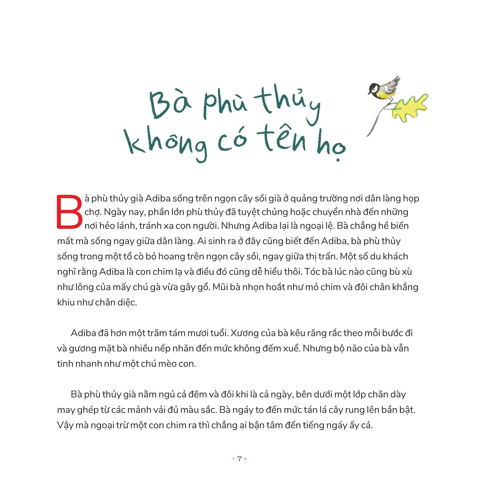 Xương của bà kêu răng rắc và khuôn mặt đầy nếp nhăn. Nhưng bộ não của bà vẫn tinh nhanh như một chú mèo con. Khi mùa xuân đến, Adiba thức dậy và khuấy động cả thị trấn nhỏ theo cách của riêng mình. Bà cho lũ trẻ chơi ném bóng tuyết giữa mùa hè, thám hiểm khu rừng mùa thu... Bà thị trưởng mới không thích một phù thủy già luộm thuộm sống trên cây sồi. Nhưng những cư dân của thị trấn này biết rất rõ rằng: Tuy đã già, nhưng bà vẫn tạo ra các phép màu.