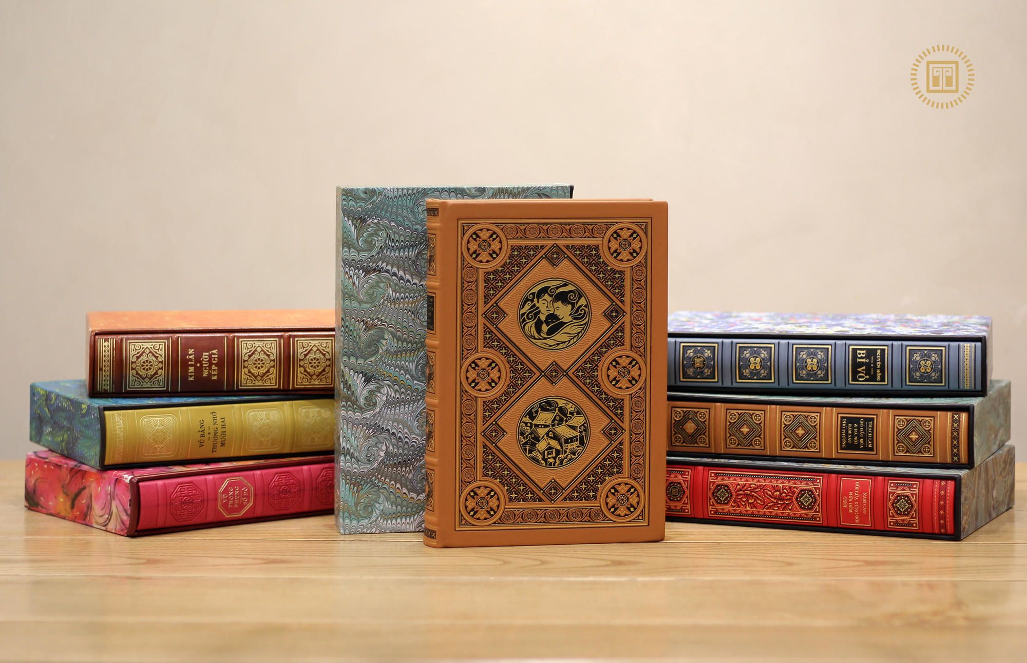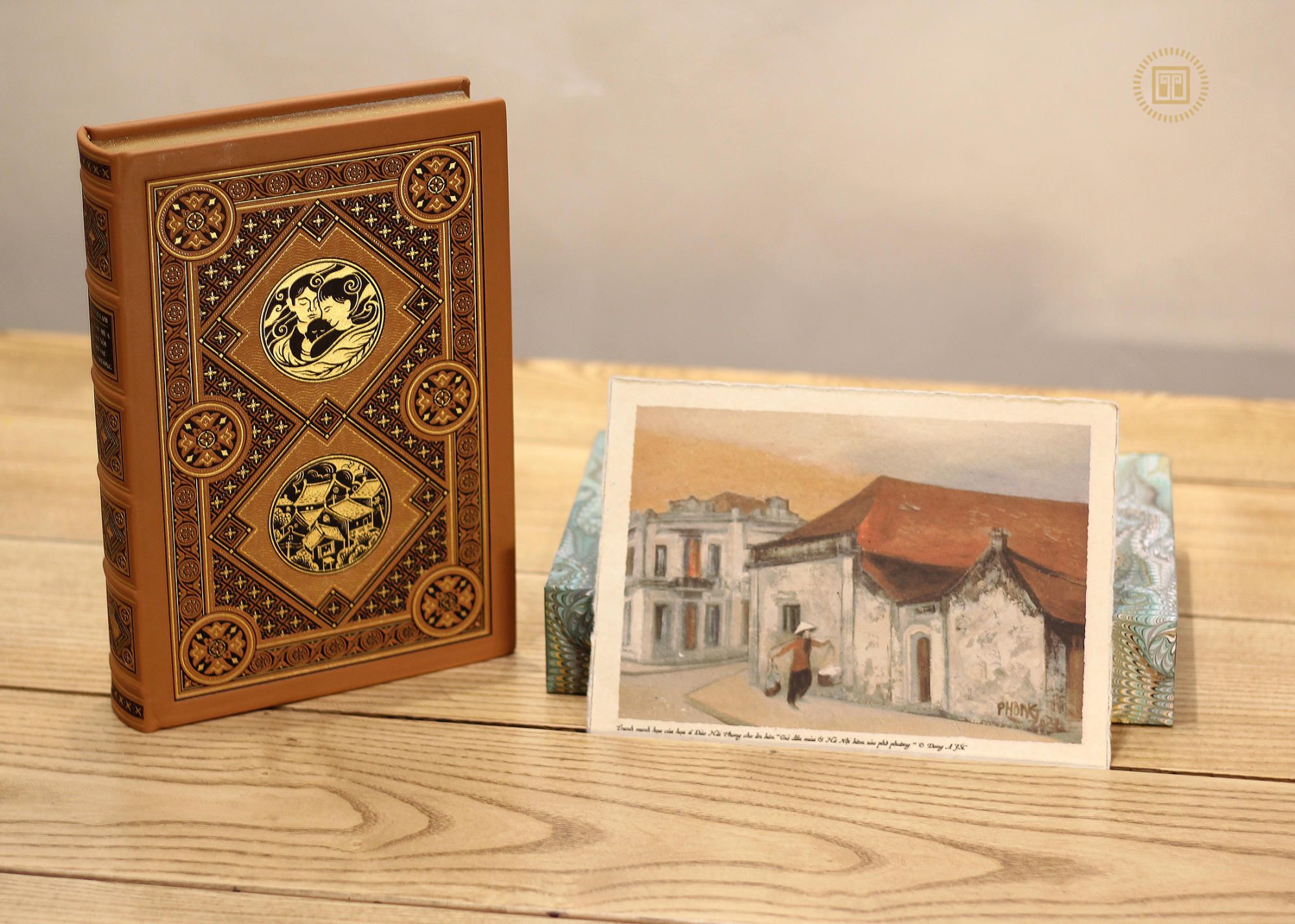 2. Bìa sách được bọc bằng da microfiber màu nâu đất. Hoa văn dập chìm. Tên sách và một số họa tiết ép nhũ 2 màu đen và vàng.