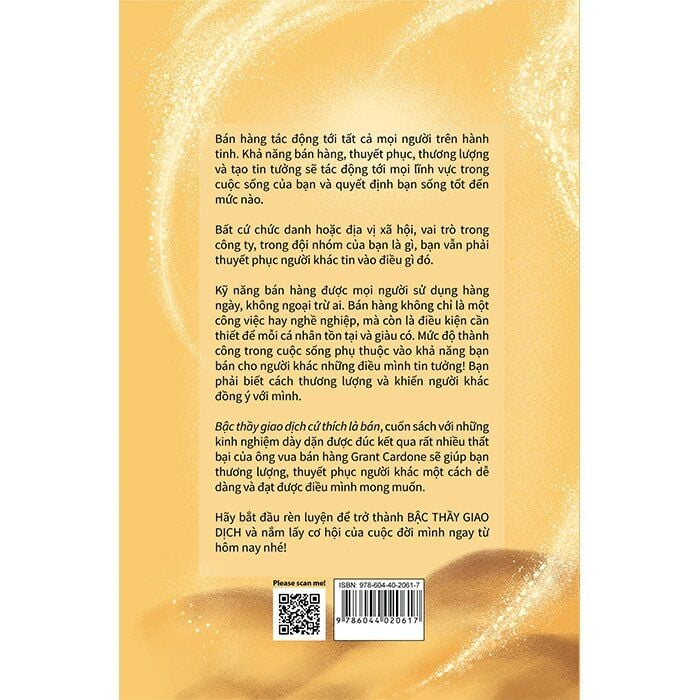 “Bậc thầy giao dịch cứ thích là bán” là cuốn sách như thế. Với những kinh nghiệm dày dặn được đúc kết qua rất nhiều những bài học về sự thất bại, cay đắng của ông vua bán hàng lừng danh Grant Cardone sẽ giúp bạn thương thượng, dễ dàng thuyết phục người khác và đạt được những gì mình mong muốn. Cuốn sách khiến bạn cảm thấy việc bán hàng trở nên “dễ như ăn kẹo” chỉ cần bạn làm theo đúng hướng dẫn, cũng như học được nghệ thuật giao tiếp và thuyết phục đỉnh cao, để từ đó nắm bắt được tâm lý khách hàng, đánh thẳng vào nhu cầu và “trái tim” của khách hàng để khiến họ tin yêu, tin dùng.