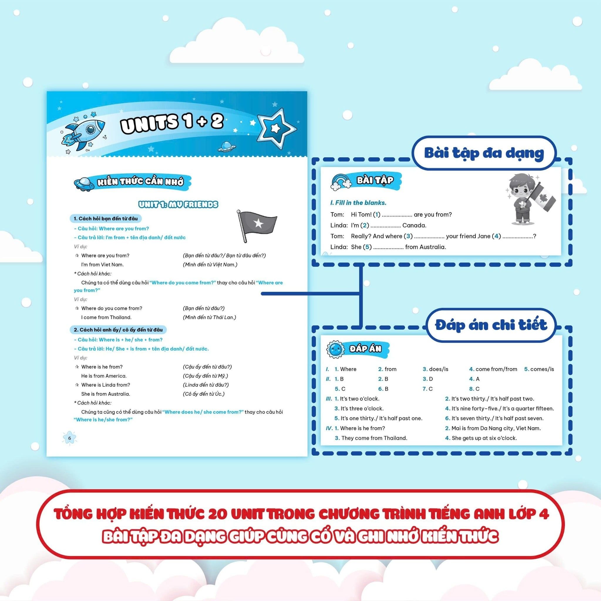 2. Tổng hợp và mở rộng toàn bộ kiến thức với 20 Unit của chương trình học tiếng Anh lớp 4 theo Bộ Giáo dục & Đào tạo. Dưới mỗi phần lý thuyết là các bài tập vận dụng kèm lời giải, giúp các em dễ dàng ghi nhớ kiến thức vừa học và biết cách vận dụng cụ thể.