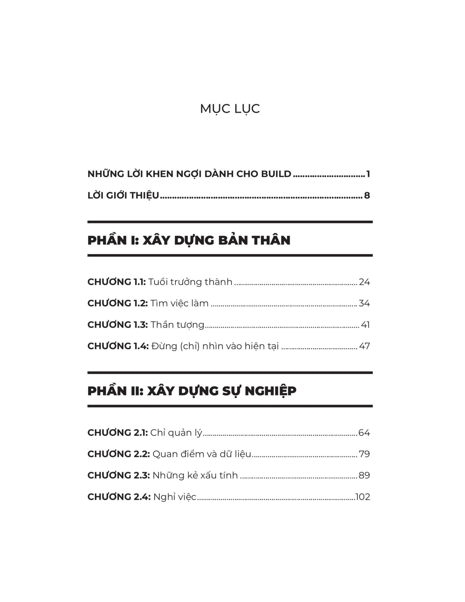 Build chứa đựng nhiều lời khuyên mà Tony Fadell, cha đẻ của iPod, Nest Labs thường chia sẻ với các sinh viên mới tốt nghiệp và các CEO, các quản lý cấp cao và thực tập sinh, cũng như bất cứ ai đang nỗ lực gây dựng sự nghiệp trong thế giới kinh doanh và sự nghiệp của riêng mình về cách khởi nghiệp, trở thành CEO, thiết kế các sản phẩm thay đổi thế giới hay kiến tạo bất cứ thứ gì vĩ đại nhất.