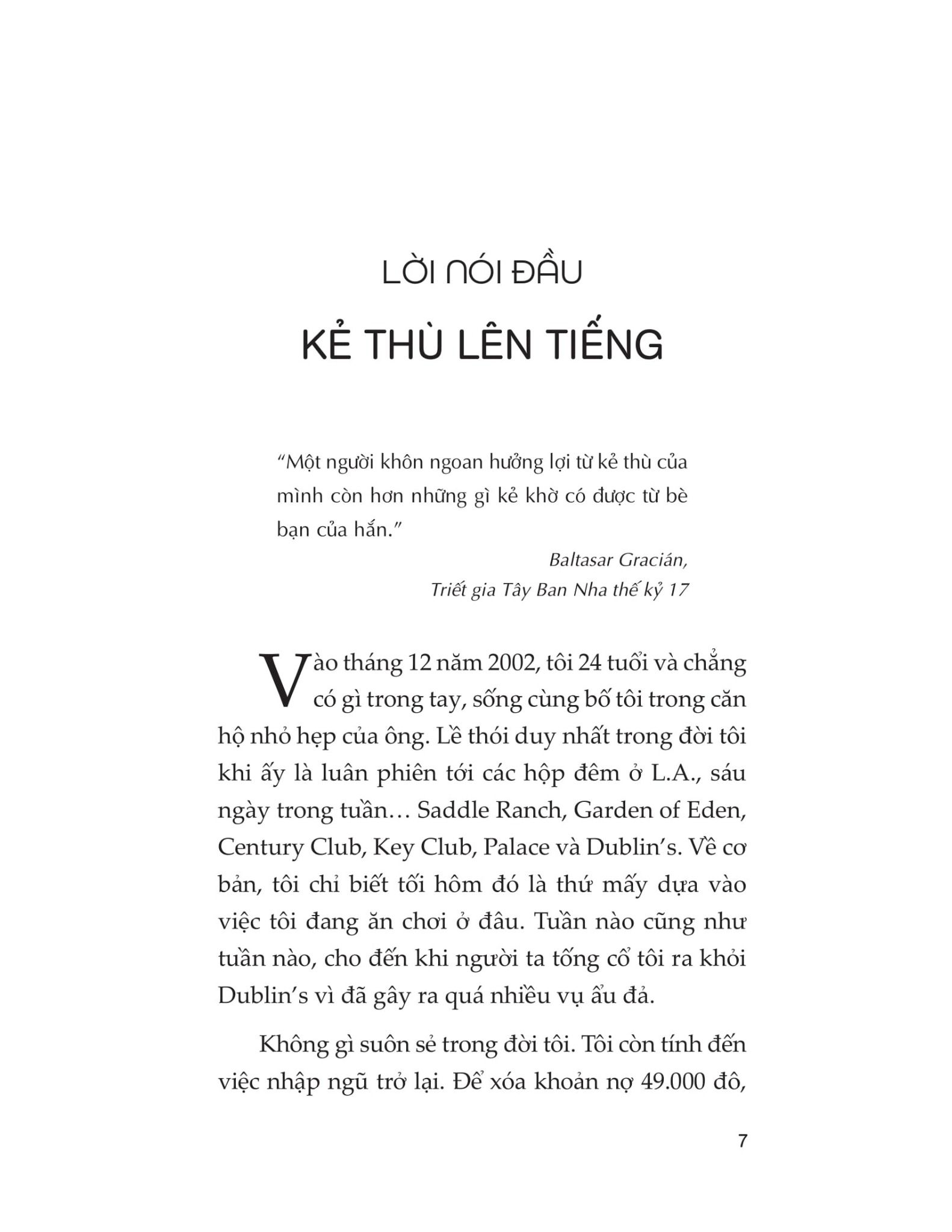 Một điểm nhấn đặc biệt trong cuốn sách là khái niệm "chọn kẻ thù" – chọn đúng đối thủ hoặc thách thức để làm nguồn động lực cho bản thân. Kẻ thù ở đây không phải là ai đó để ganh đua, mà là yếu tố giúp bạn duy trì sự tập trung và sục sôi quyết tâm tiến về phía trước.