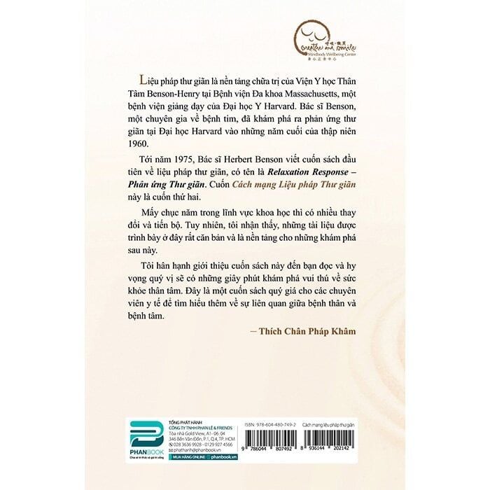 Được biết đến như là Giám đốc danh dự của Viện Benson-Henry và là người tiên phong trong lĩnh vực Y học Thân Tâm thế giới, Herbert Benson đã cùng tác giả William Proctor chia sẻ những khám phá khoa học mới nhất về Liệu Pháp Thư Giãn và cách áp dụng nó trong điều trị nhiều căn bệnh hiện đại như cao huyết áp, đau nhức kinh niên, sợ hãi, trầm cảm và nhiều bệnh khác.