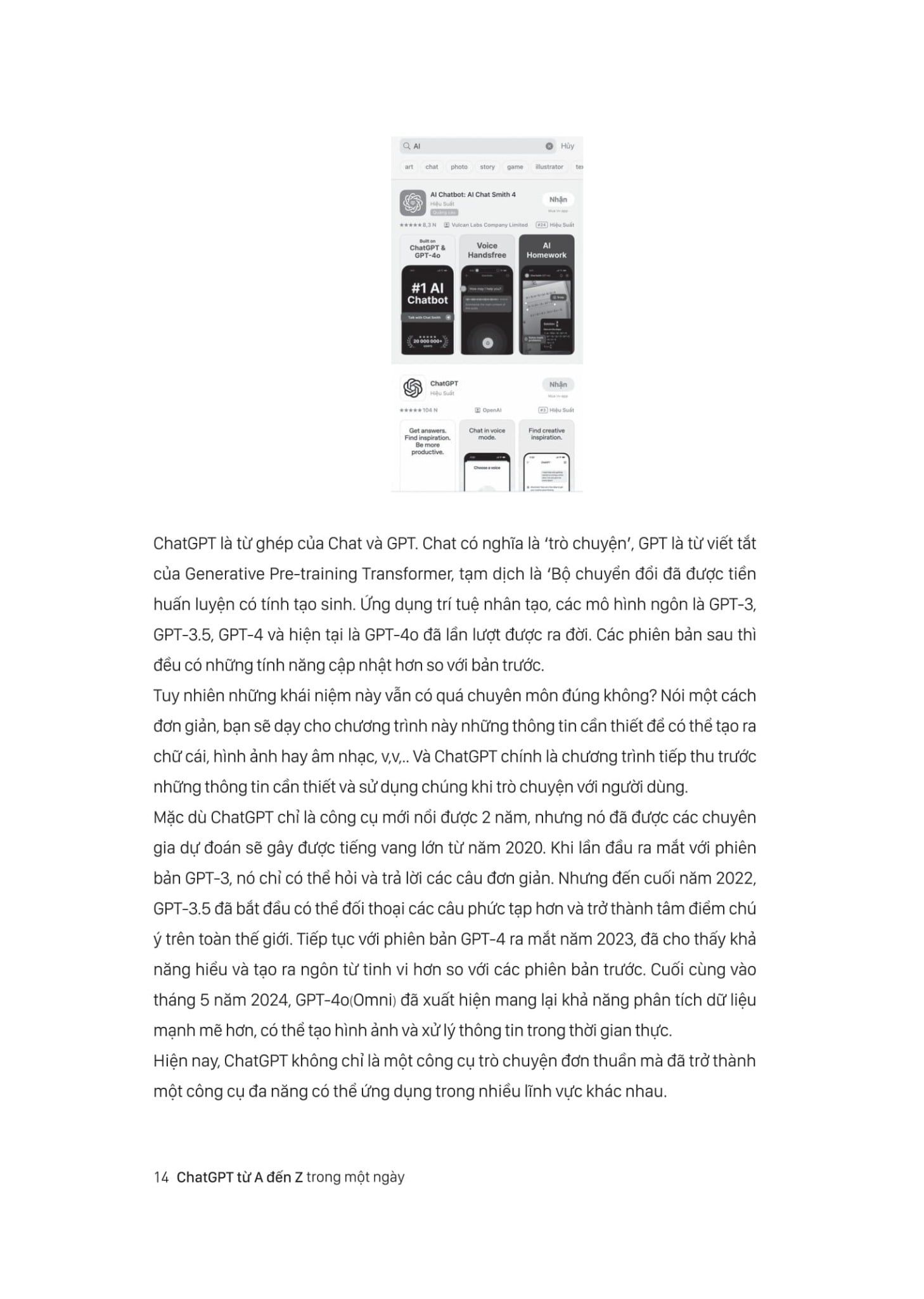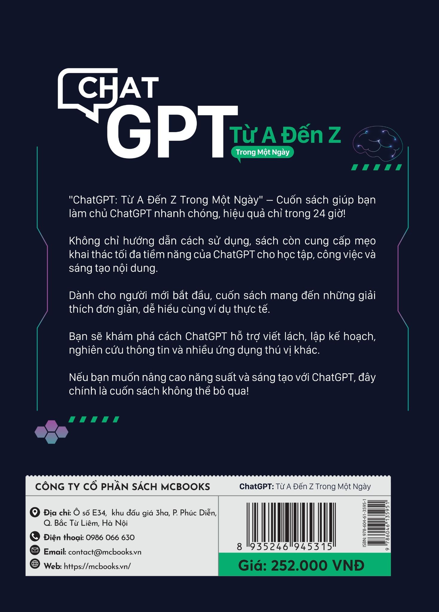 “ChatGPT Từ A Đến Z Trong Một Ngày” là cuốn sách hướng dẫn toàn diện, giúp bạn nắm vững cách sử dụng ChatGPT từ cơ bản đến nâng cao một cách nhanh chóng, trực quan và dễ hiểu. Không cần bạn phải có kiến thức công nghệ phức tạp, cuốn sách được thiết kế để bất kỳ ai cũng có thể áp dụng ngay các kỹ năng AI vào công việc và đời sống – chỉ trong một ngày.