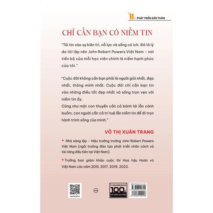 “Chỉ cần bạn có niềm tin” là cuốn tự truyện của tác giả Võ Thị Xuân Trang, kể về hành trình đầy cảm hứng từ một cô gái miền Tây đến nữ doanh nhân thành đạt, người sáng lập và điều hành trường John Robert Powers Việt Nam.
