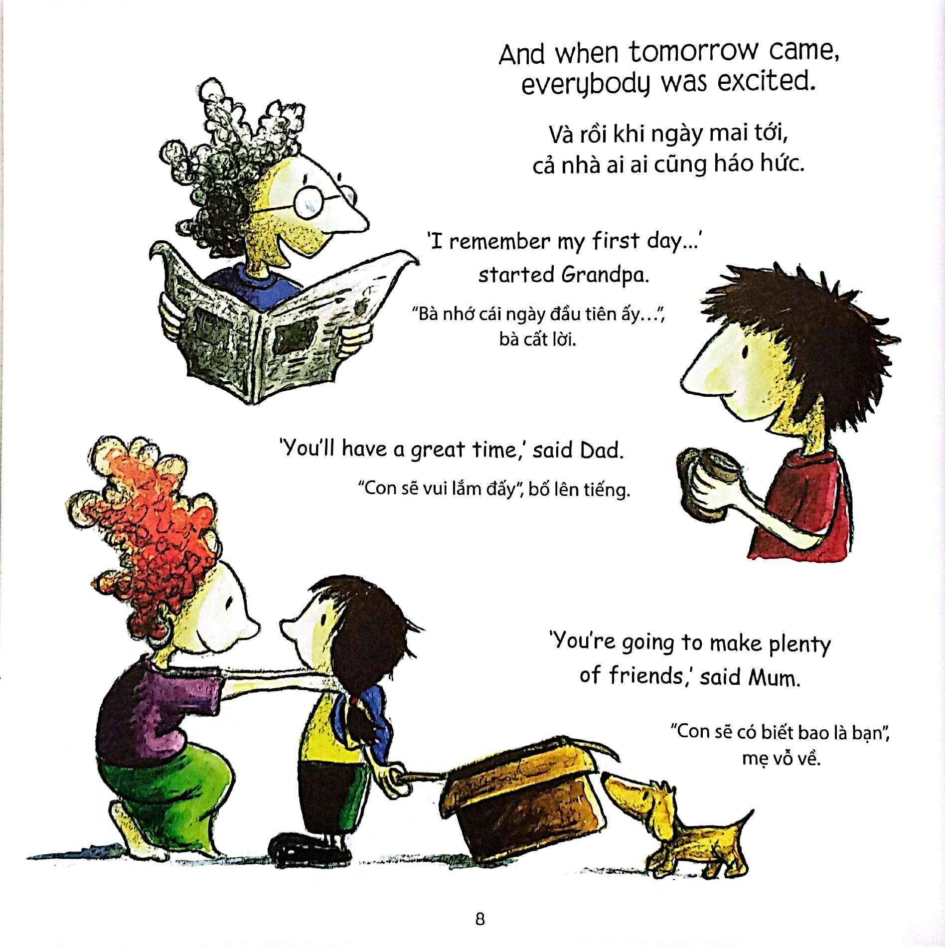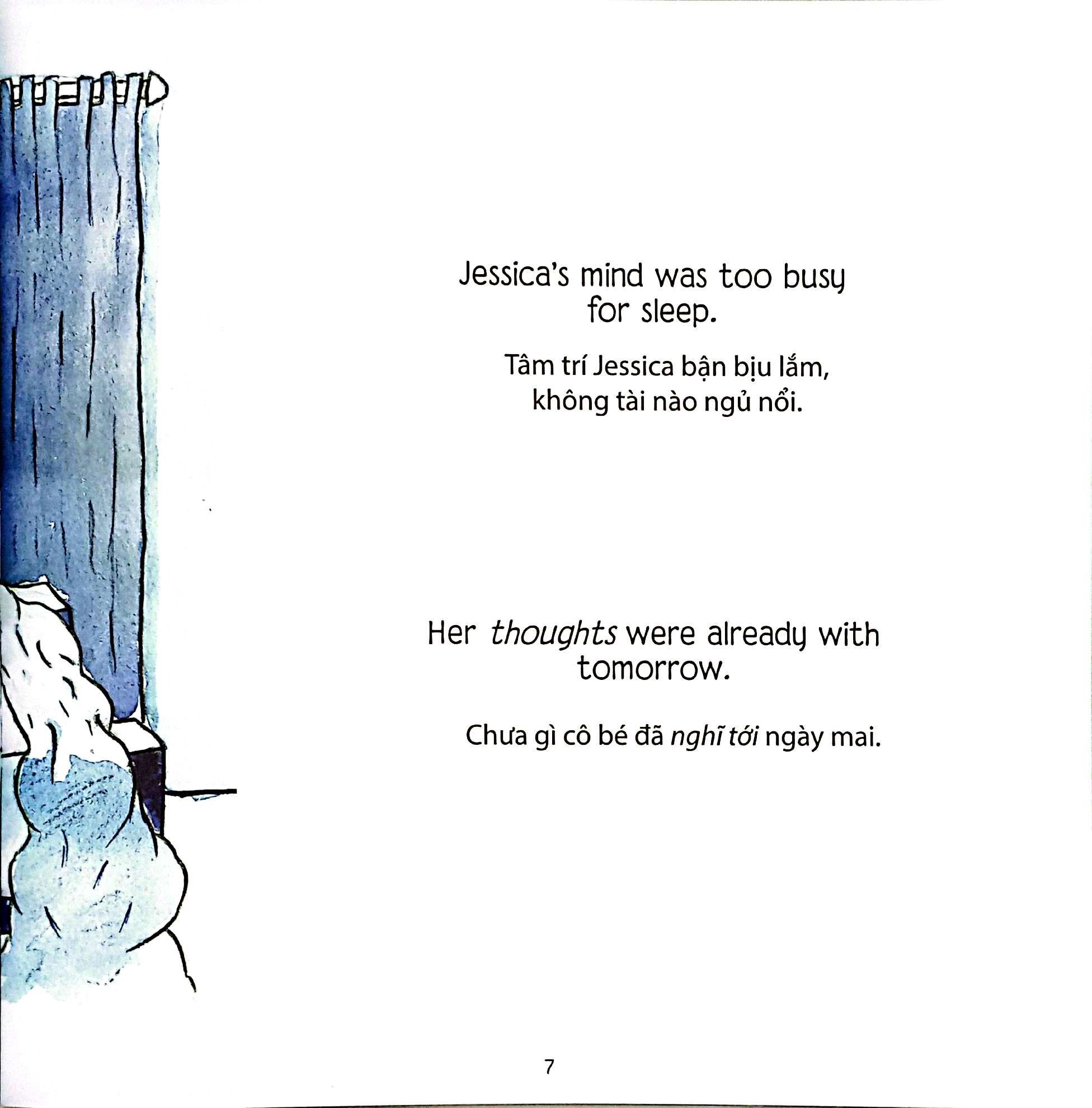 Jessica trong câu chuyện là một bé gái ngồi trên xe lăn, đang háo hức đến mất ngủ vì ngày mai. Ngày mai có gì đặc biệt đến thế nhỉ? Ngày đầu tiên đi học! Cả gia đình cũng háo hức theo cô bé, bà, bố, mẹ đều chia sẻ những cảm xúc, những lời động viên.