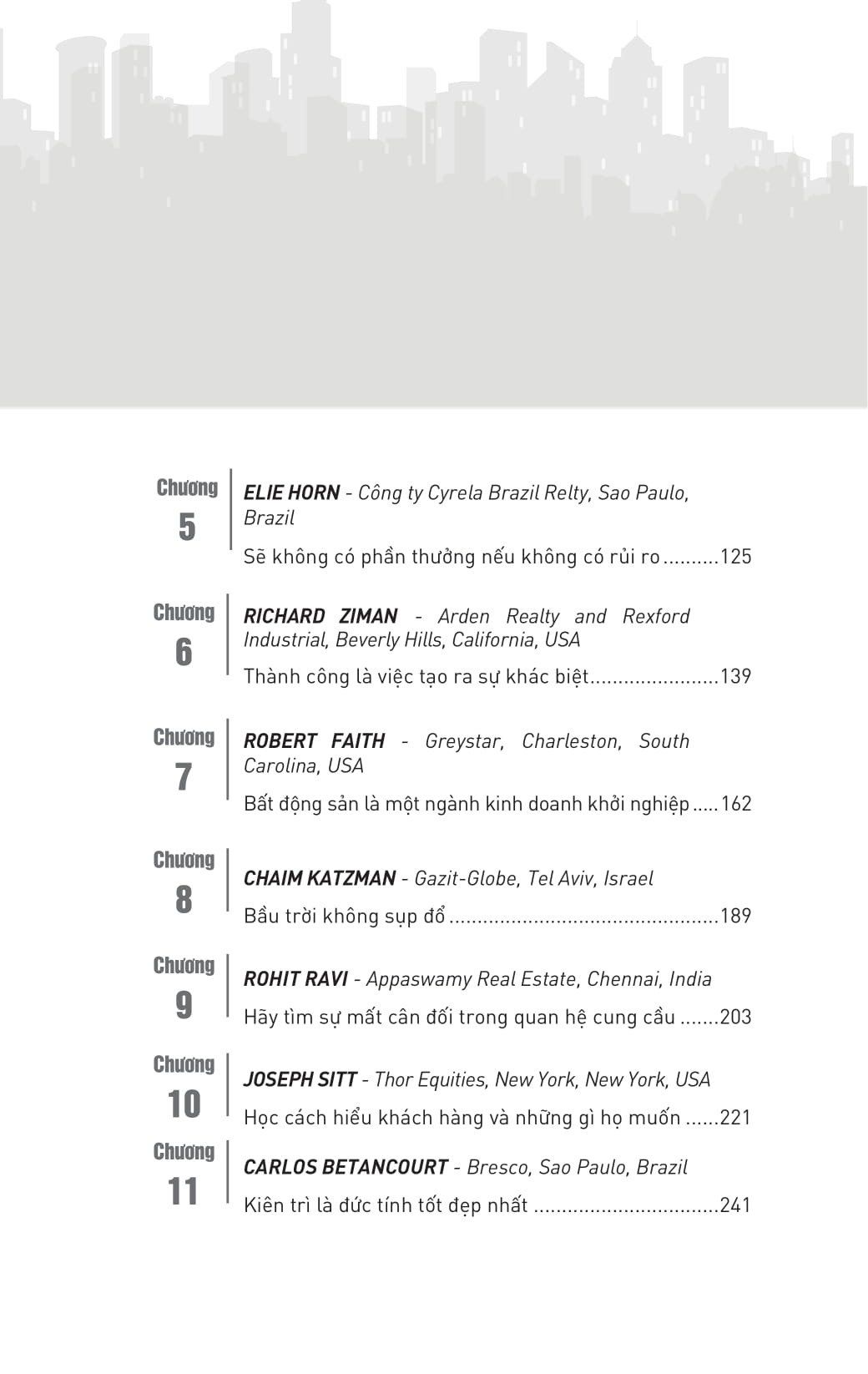 Tác giả Erez Cohen, sau nhiều năm làm việc và phỏng vấn các tên tuổi lớn như Richard Mack, Sam Zell, Ronald Terwilliger, Elie Horn, Joseph Sitt… đã đúc kết thành những bài học nền tảng và thực tiễn để bất kỳ ai dù là nhà đầu tư cá nhân, doanh nhân hay chuyên gia cũng có thể áp dụng.
