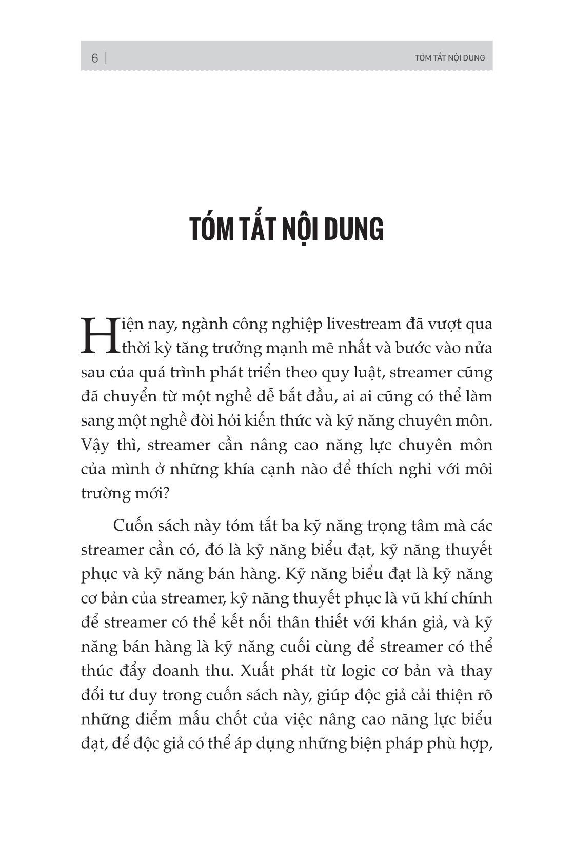 Cuốn sách tóm tắt 3 kỹ năng trọng tâm mà các streamer cần có, đó là kỹ năng biểu đạt, kỹ năng thuyết phục và kỹ năng bán hàng. Kỹ năng biểu đạt là kỹ năng cơ bản của streamer, kỹ năng thuyết phục là vũ khí chính để streamer có thể kết nối thân thiết với khán giả, và kỹ năng bán hàng là kỹ năng cuối cùng để streamer có thể thúc đẩy doanh thu. Xuất phát từ logic cơ bản và thay đổi tư duy trong cuốn sách này, giúp độc giả cải thiện rõ những điểm mấu chốt trong việc nâng cao năng lực biểu đạt, để độc giả có thể áp dụng những biện pháp phù hợp, trở thành bậc thầy về diễn đạt với những câu nói có giá trị.