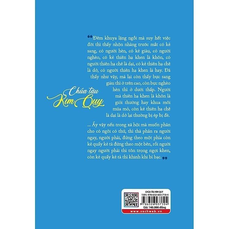 "...Đêm khuya lặng ngồi mà suy hết việc đời thì thấy nhộn nhàng trước mắt có kẻ sang, có người hèn, có kẻ giàu, có người nghèo, có kẻ thiên hạ khen là khôn, có người thiên hạ chê là dại, có kẻ thiên hạ chê là dở, có người thiên hạ khen là hay. Đã thấy như vậy, mà lại còn thấy bực sang giàu thì ở trên cao, còn bực nghèo hèn thì ở dưới thấp. Người mà thiên hạ khen là khôn là giỏi thường hay khua môi múa mỏ, còn kẻ thiên hạ chê là dại là dở lại thường bị ép bị đè.