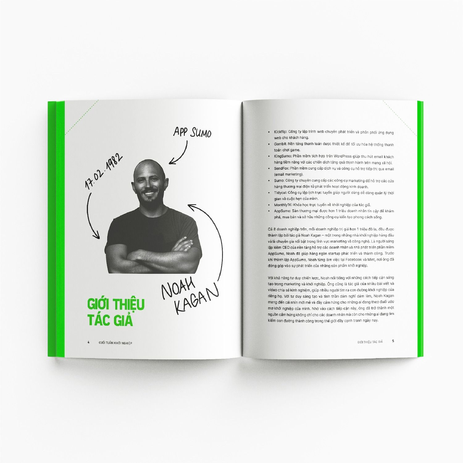 Noah Kagan - Tác giả cuốn sách được biết đến là nhà sáng lập của 8 doanh nghiệp trị giá trên 1 triệu đô-la, cựu nhân viên thứ 30 tại Facebook, và là chuyên gia nổi bật trong lĩnh vực marketing và công nghệ. Điểm đặc biệt trên hành trình của tác giả là cách mà 8 doanh nghiệp nói trên - phần lớn đều được Noah lên ý tưởng và bắt tay vào thực hiện chỉ trong đúng 1 tuần.