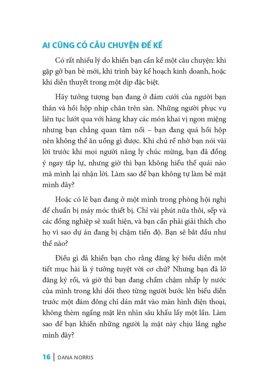 Tác giả Dana Norris viết lại một cách giản dị và nhiều gợi ý dễ hiểu để rút ra những bí quyết đơn giản nhưng hiệu quả trong giao tiếp, giúp người đọc có thể nói chuyện với bất cứ ai, vào bất cứ thời điểm nào, tại bất cứ nơi nào. Ngoài ra, cuốn sách còn nhằm giúp người đọc liên tục trau dồi khả năng giao tiếp, trở thành người kể chuyện, giao tiếp ngày càng tốt hơn