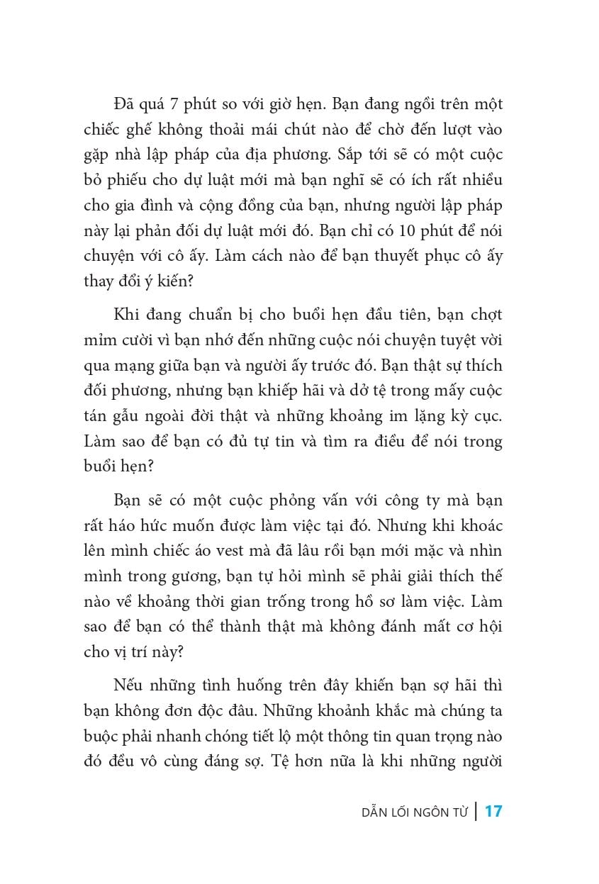 Nghệ thuật kể chuyện không chỉ để khuấy động không khí cho đám đông mà còn là công cụ hữu ích cho cuộc sống. Ví dụ khi bạn đang tham dự một cuộc họp kinh doanh, một câu chuyện sẽ giúp bạn nhấn mạnh quan điểm của mình hơn rất nhiều; một câu chuyện cũng rất cần thiết để kêu gọi tình nguyện viên cho một tổ chức. Cho dù bạn đang kể chuyện cho bạn bè, sếp, khách hàng hay thậm chí một người xa lạ, quyển sách “Dẫn lối ngôn từ” cũng sẽ giúp ích cho bạn. Bạn sẽ nhận ra rằng: Đúng, bạn có thể kể chuyện.