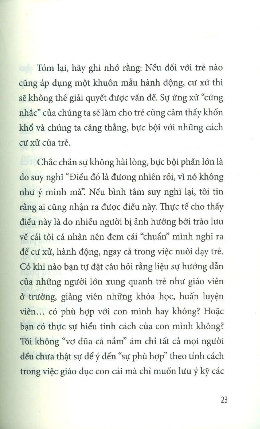 Mỗi đứa trẻ là một bài toán đố mà chúng ta phải đi tìm câu trả lời. Với phương pháp “hiểu cách phân loại trẻ” được trình bày cụ thể trong cuốn sách này,chúng tôi hy vọng rằng các bậc phụ huynh sẽ tìm được phương pháp phù hợp trong quá trình nuôi dạy con cái và hãy áp dụng nó như một “chiến thuật” hợp lí.