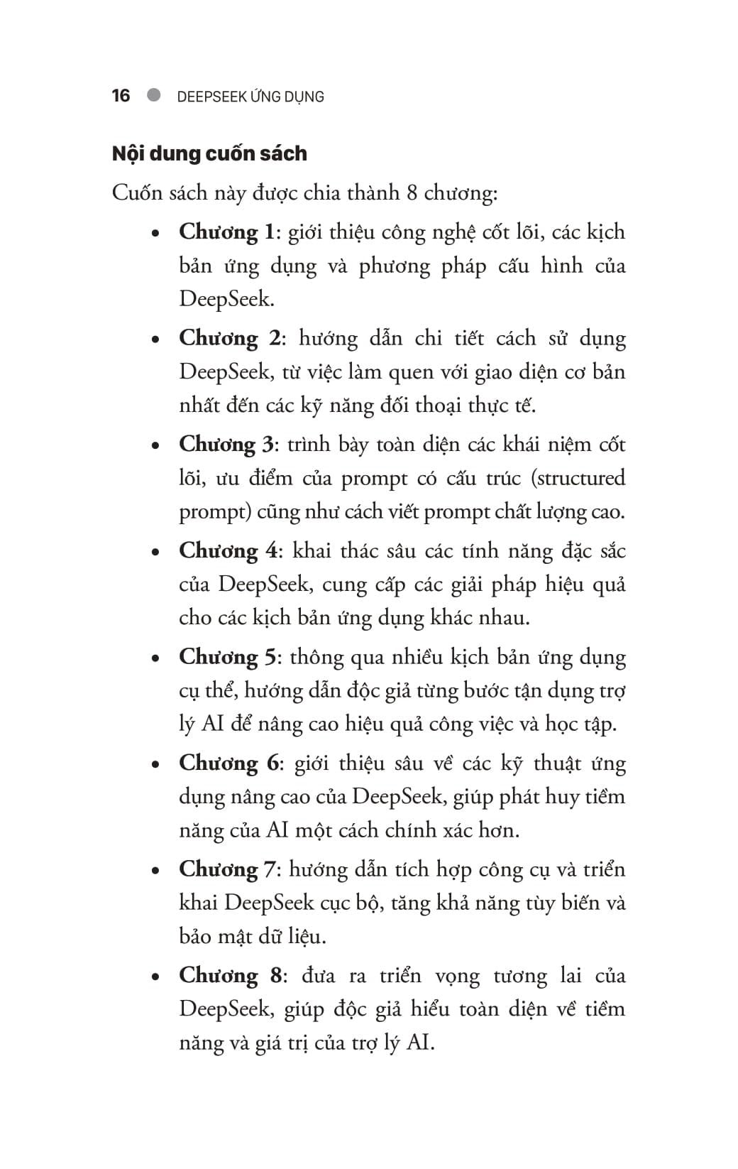 - Chương 8: đưa ra triển vọng tương lai của DeepSeek, giúp độc giả hiểu toàn diện về tiềm năng và giá trị của trợ lý AI.