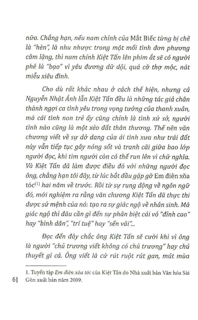 “Nếu bạn từng đọc truyện ngắn của Kiệt Tấn, bạn sẽ nhận ra phong cách Nam bộ cùa ông, một kiểu miền Tây chơn chất không màu mè diêm dúa, nhưng khác với lối viết miệt vườn của Nguyễn Ngọc Tư, lối kể của Kiệt Tấn rất tài tử thành thị và Tây học. Tư duy của Kiệt Tấn thoáng đãng rộng rãi, vừa hào sảng Nam bộ, vừa phóng khoáng kiểu Tây, nhưng tâm hồn ông thì thuần Việt. Sự pha trộn này khiến câu chuyện ông kể dẫu đã xưa đâu như chừng 70 năm trước, nó vẫn mang nét hiện đại một cách lạ lùng.” Nguyễn Hoàng Liên