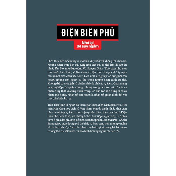 Trần Thái Bình là người đã tham gia Chiến dịch Điện Biên Phủ, Hội viên Hội khoa học lịch sử Việt Nam, ông đã dành nhiều thời gian nhìn lại những sự kiện trong trận quyết chiến chiến lược lớn ở Điện Biên Phủ năm 1954, với những tư liệu trực tiếp và gián tiếp, từ ở phía ta và ở phía đối phương, để biên soạn tác phẩm Điện Biên Phủ - Nhớ lại để suy ngẫm, giúp độc giả có thể thấy rõ hơn, sáng hơn những ý nghĩa và bài học lịch sử, có ích cho việc bảo vệ sự trường tồn của đất nước, và hòa bình hữu nghị giữa các dân tộc.