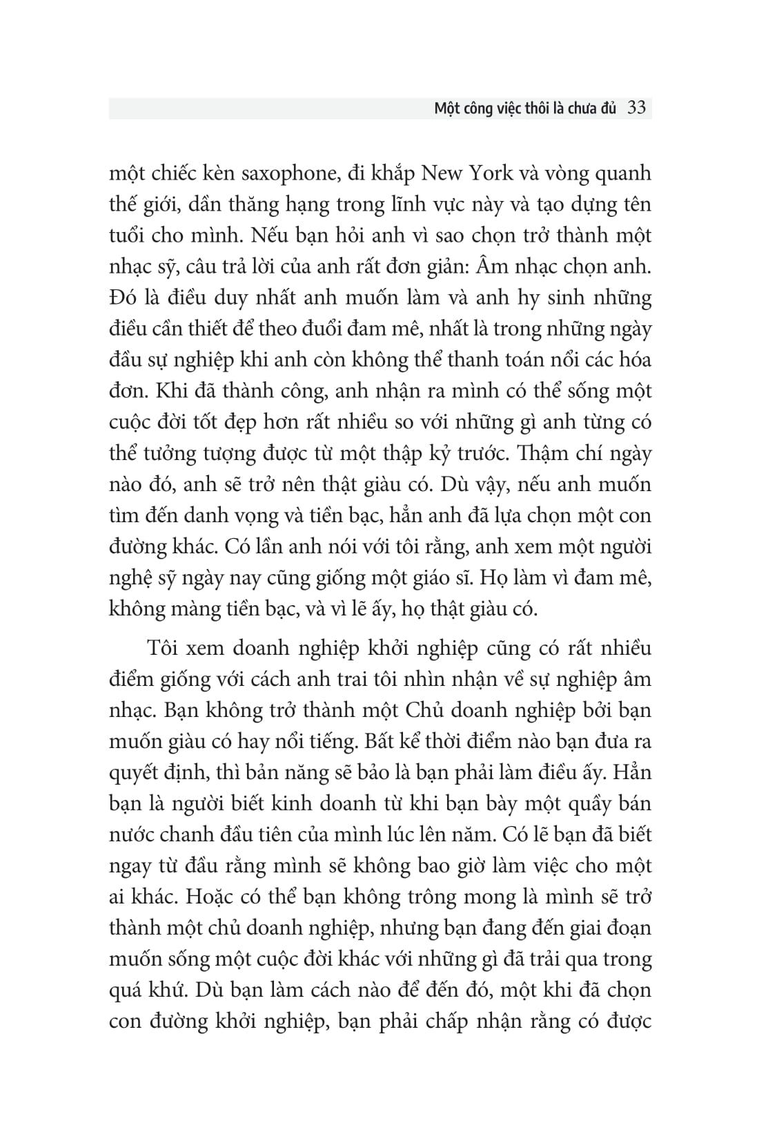 Chúng ta có thể bắt đầu làm một việc gì đó với nhiều lý do, nhưng duy chỉ có sự đam mê và trách nhiệm mới khiến ta ở lại. Ở bất cứ đâu, bạn cũng thấy người ta đang cổ vũ cho tinh thần khởi nghiệp, tính linh hoạt và tự chủ hơn bao giờ hết, ngay cả khi họ vẫn đang có cho mình những công việc toàn thời gian ở các công ty lớn.