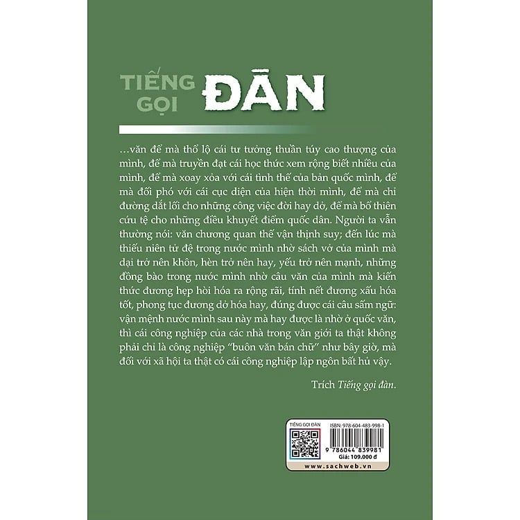 ...văn đề mà thổ lộ cái tư tưởng thuần túy cao thượng của mình, để mà truyền đạt cái học thức xem rộng biết nhiều của mình, để mà xoay xỏa với cái tình thế của bản quốc mình, để mà đối phó với cái cục diện của hiện thời mình, để mà chỉ đường dắt lỗi cho những công việc đòi hay dở, để mà bổ thiên cứu tệ cho những điều khuyết điểm quốc dân. Người ta vẫn thường nói: văn chương quan thế vận thịnh suy; đến lúc mà thiểu niên tử đệ trong nước mình nhờ sách vở của mình mà dại trở nên khôn, hèn trở nên hay, yếu trở nên mạnh, những đồng bào trong nước mình nhờ câu văn của mình mà kiến thức đương hẹp hòi hóa ra rộng rãi, tính nết đương xấu hóa tốt, phong tục đương dở hóa hay, đúng được cái câu sấm ngữ: vận mệnh nước mình sau này mà hay được là nhờ ở quốc văn, thì cái công nghiệp của các nhà trong văn giới ta thật không phải chỉ là công nghiệp “buôn văn bán chữ" như bây giờ, mà đối với xã hội ta thật có cái công nghiệp lập ngôn bất hủ vậy.