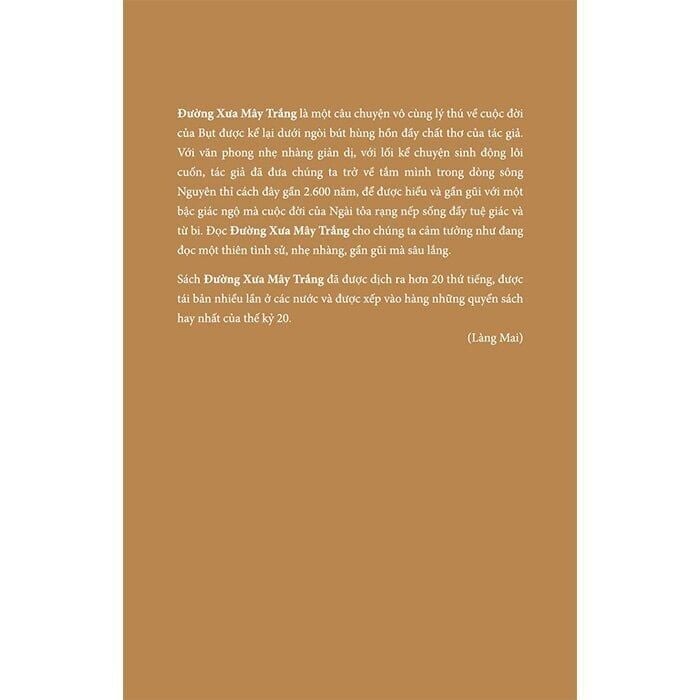 Đường Xưa Mây Trắng - Theo Gót Chân Bụt là một câu chuyện vô cùng lý thú về cuộc đời của Bụt được kể lại dưới ngòi bút hùng hồn đầy chất thơ của tác giả. Với văn phong nhẹ nhàng giản dị, với lối kể chuyện sinh động lôi cuốn, tác giả đã đưa chúng ta trở về tắm mình trong dòng sông Nguyên thỉ cách đây gần 2.600 năm, để được hiểu và gần gũi với một bậc giác ngộ mà cuộc đời của Ngài tỏa rạng nếp sống đầy tuệ giác và từ bi. Đọc Đường Xưa Mây Trắng cho chúng ta cảm tưởng như đang đọc một thiên tình sử, nhẹ nhàng, gần gũi mà sâu lắng. Sách Đường Xưa Mây Trắng - Theo Gót Chân Bụt đã được dịch ra hơn 20 thứ tiếng, được tái bản nhiều lần ở các nước và được xếp vào hàng những quyển sách hay nhất của thế kỷ 20.