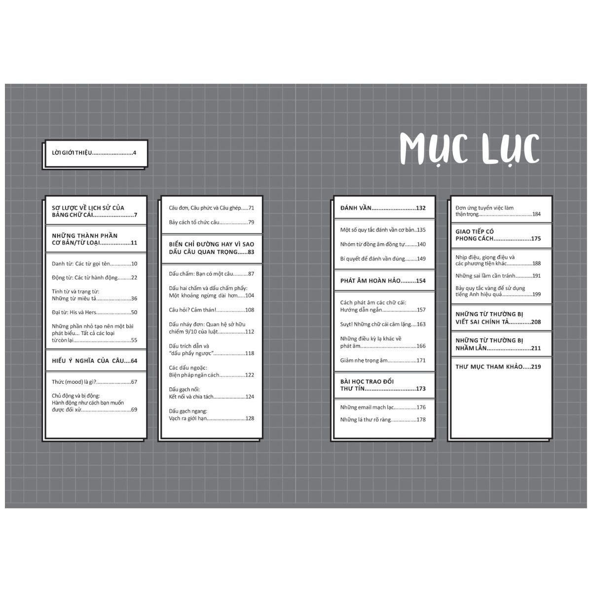 Bắt đầu từ bảng chữ cái, cuốn sách sẽ từng bước khám phá từ những yếu tố cơ bản của tiếng Anh viết và nói – chính tả, trật tự từ, dấu câu, từ loại – cho đến ngữ điệu, những sai lầm cần tránh và bí quyết để đảm bảo tính mạch lạc và thậm chí là tính thanh lịch.