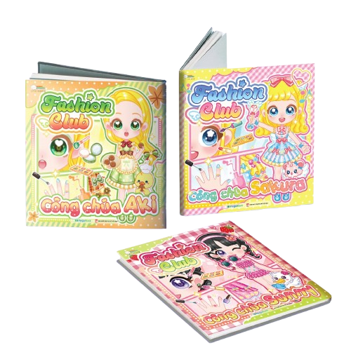 Bộ sách bóc dán Fashion Club gồm 3 cuốn: Công chúa Aki, Công chúa Sunny và Công chúa Sakura, mang đến thế giới thời trang đầy màu sắc cho các bé yêu làm đẹp. Mỗi cuốn có 18 nàng công chúa xinh xắn cùng 200+ sticker bóc dán đa dạng từ váy áo, giày dép, phụ kiện đến nail và trang sức. Bé có thể thỏa sức trang điểm, phối đồ và sáng tạo phong cách riêng cho từng công chúa, vừa chơi vừa khơi gợi trí tưởng tượng và gu thẩm mỹ ngay từ nhỏ.