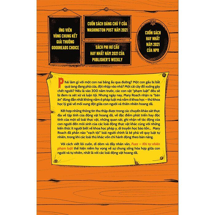 Phải làm gì với một con nai băng ẩu qua đường? Một con gấu bị bắt quả tang đang phá cửa, đột nhập vào nhà? Một cái cây đổ xuống gây chết người? Nếu là vào 300 năm trước, các con vật “phạm luật” đều sẽ bị đem ra xét xử và luận tội. Nhưng ngày nay, Mary Roach nhận ra “bản án” đúng đắn nhất không nằm ở pháp luật mà nằm ở khoa học - thứ khoa học lý giải về mối xung đột giữa con người và thiên nhiên hoang dã.