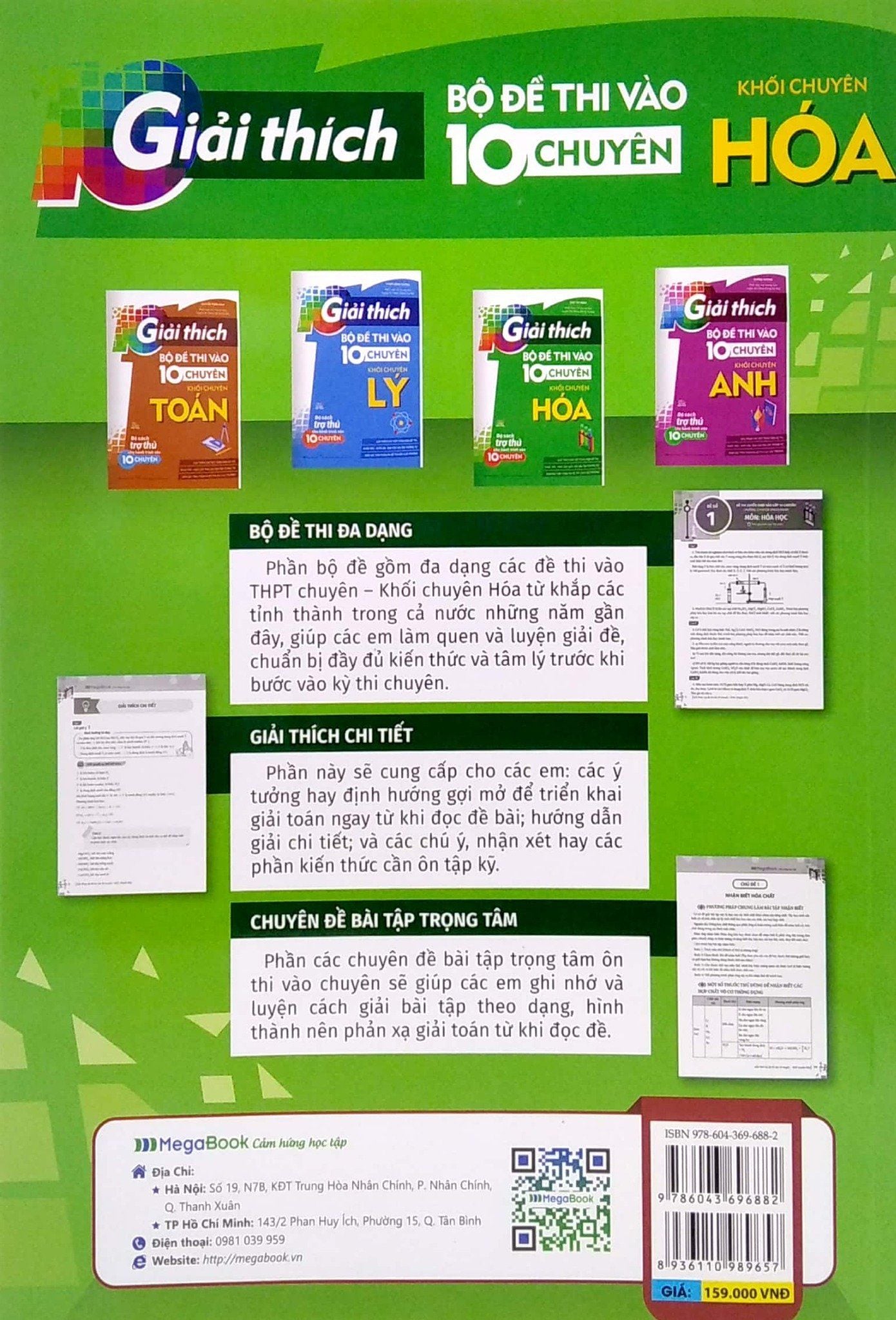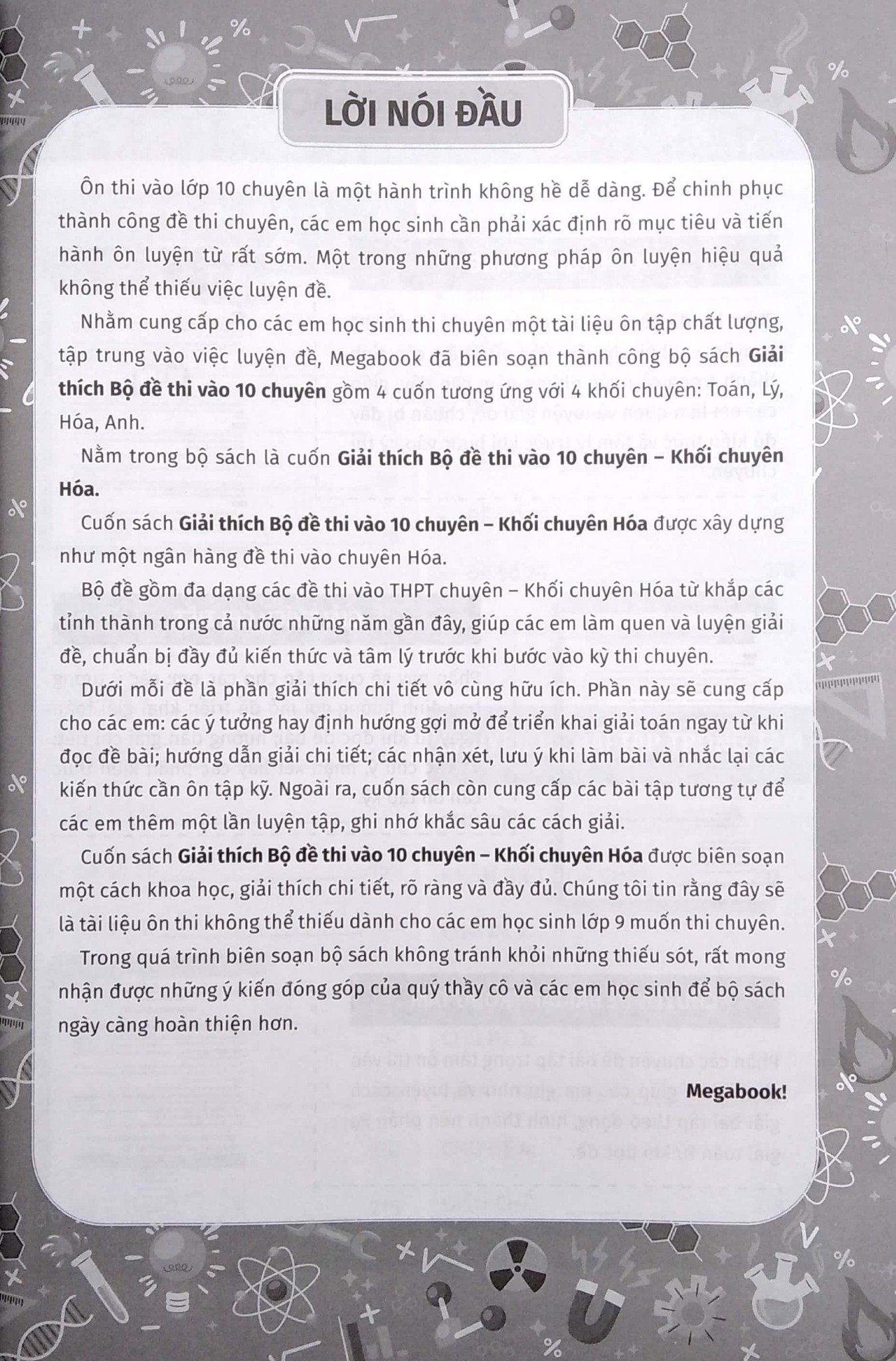 Nhằm cung cấp cho các em học sinh thi chuyên một tài liệu ôn tập chất lượng, tập trung vào việc luyện đề, Megabook đã biên soạn thành công bộ sách Giải thích Bộ đề thi vào 10 chuyên gồm 4 cuốn tương ứng với 4 khối chuyên: Toán, Lý, Hóa, Anh.