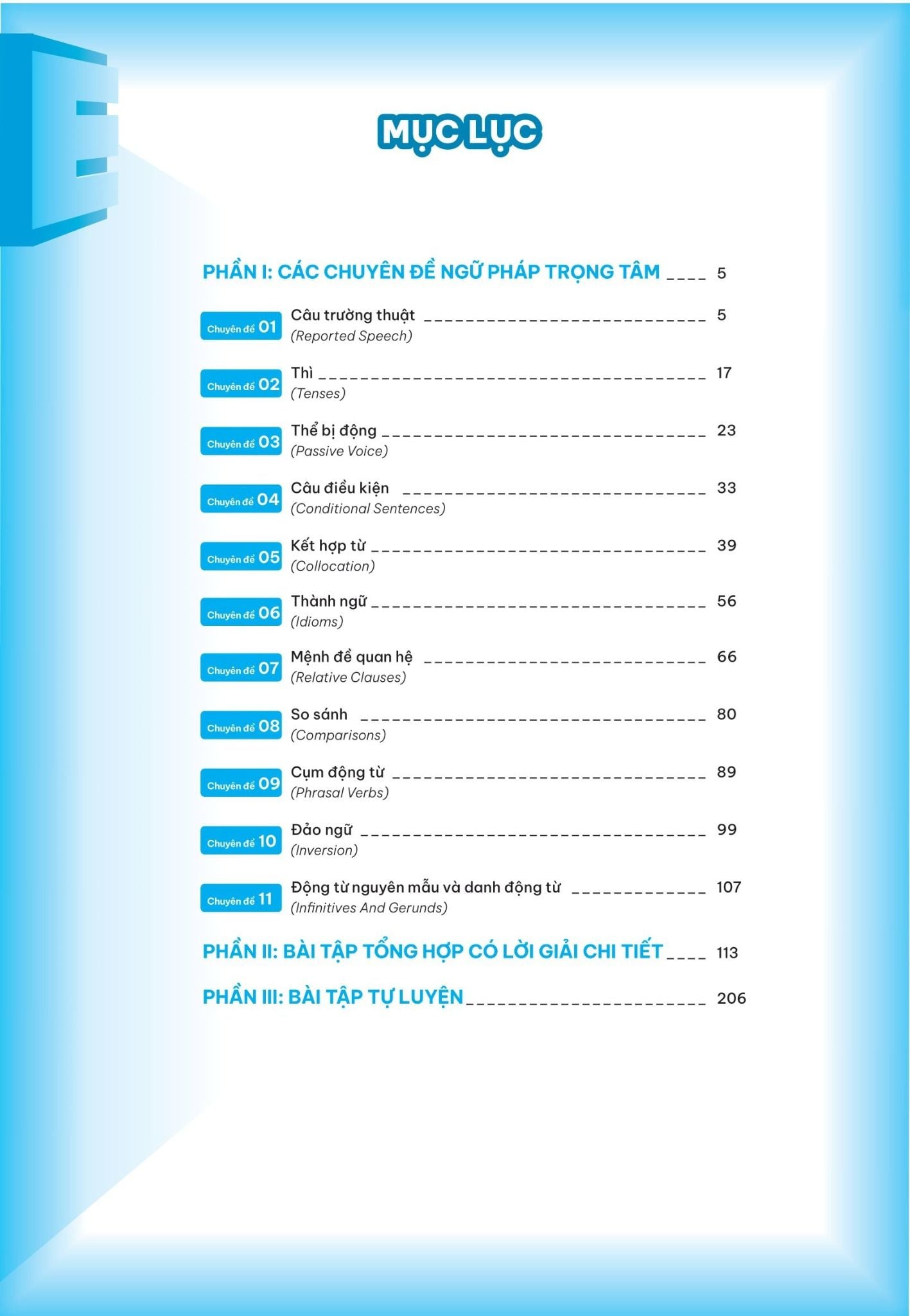 Cuốn sách bao gồm 11 chuyên đề ngữ pháp tiếng Anh trọng tâm, giúp các em học sinh có cơ hội củng cố và nâng cao kiến thức ngữ pháp một cách hiệu quả. Các bài tập trong cuốn sách được thiết kế cẩn thận và kèm theo lời giải chi tiết, giúp học sinh hiểu rõ cách giải quyết và học từ các bài tập.