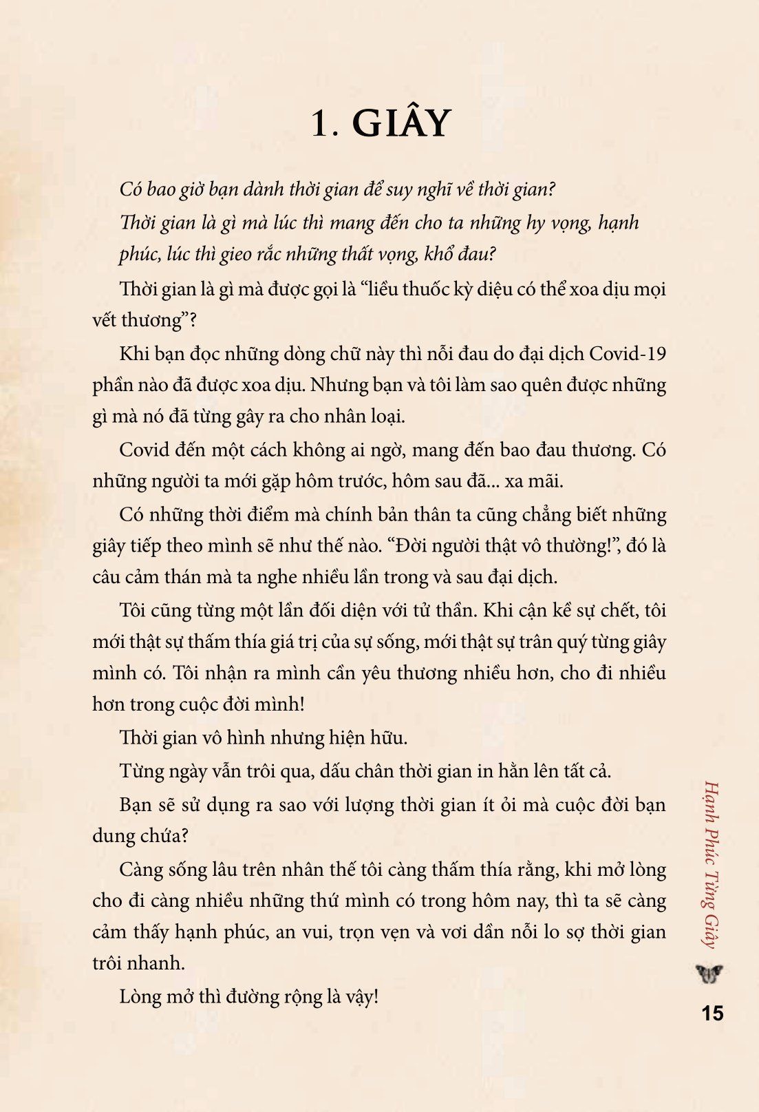 Sách Hạnh Phúc Từng Giây bao gồm 52 chương là 52 câu chuyện nhỏ nhưng mang lại nguồn cảm hứng bất tận có thể giúp chúng ta “sạc pin” tinh thần mỗi lúc chênh vênh. Quyển sách sẽ mang lại nhiều cung bậc cảm xúc khác nhau qua những hành trình, những câu chuyện của tác giả mà đâu đó ta cũng sẽ thấy bản thân mình trong đó.