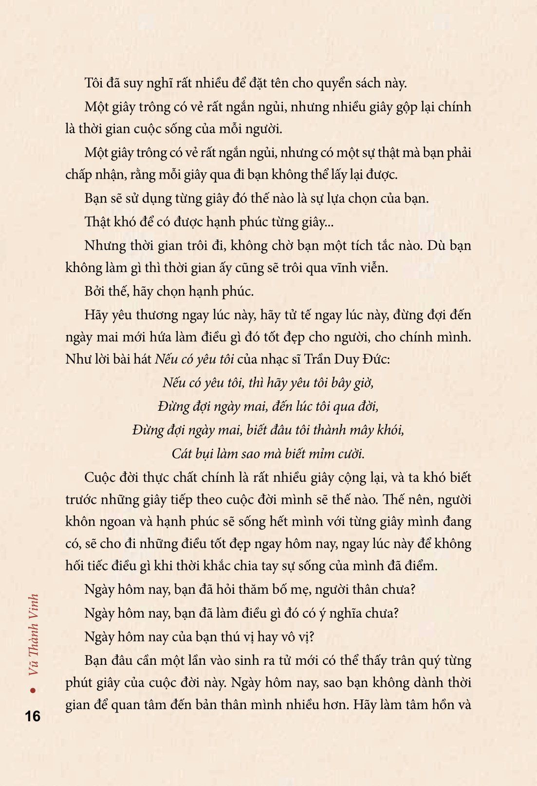 “Đời là bể khổ”, nhưng ta có quyền chọn để hạnh phúc mở lối. Chính vì lý do đó mà quyển sách nhỏ bé Hạnh phúc từng giây đã ra đời.