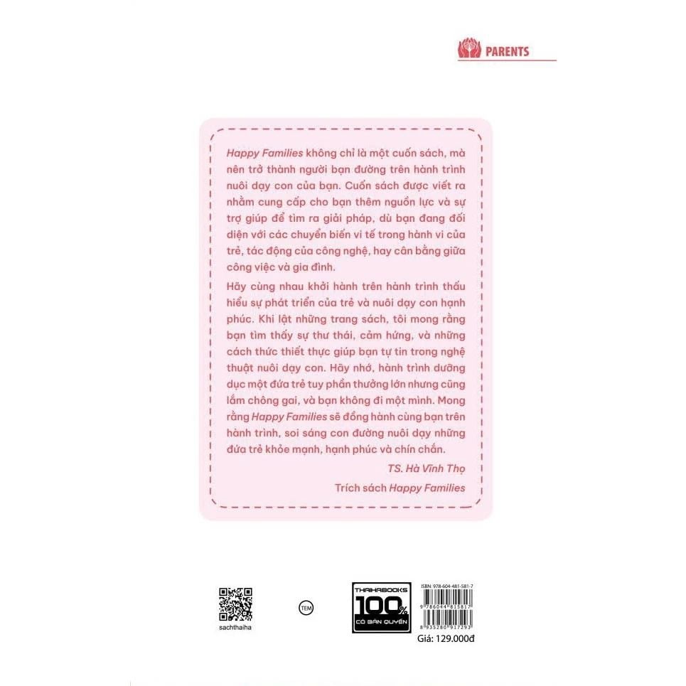 TS. Hà Vĩnh Thọ chia sẻ: “Happy Families – Gia đình hạnh phúc” dành riêng cho những ai là cha mẹ trẻ. Cuốn sách này tiếp nối Happy Children trong việc mang đến các nguyên tắc nền tảng cùng một số đề xuất thực tiễn, chứ không nặng thông tin khoa học, đồng thời nhắm đến đối tượng cha mẹ đang cần các hướng dẫn tức thới, ứng dụng ngay trong cuộc sống bận rộn”.