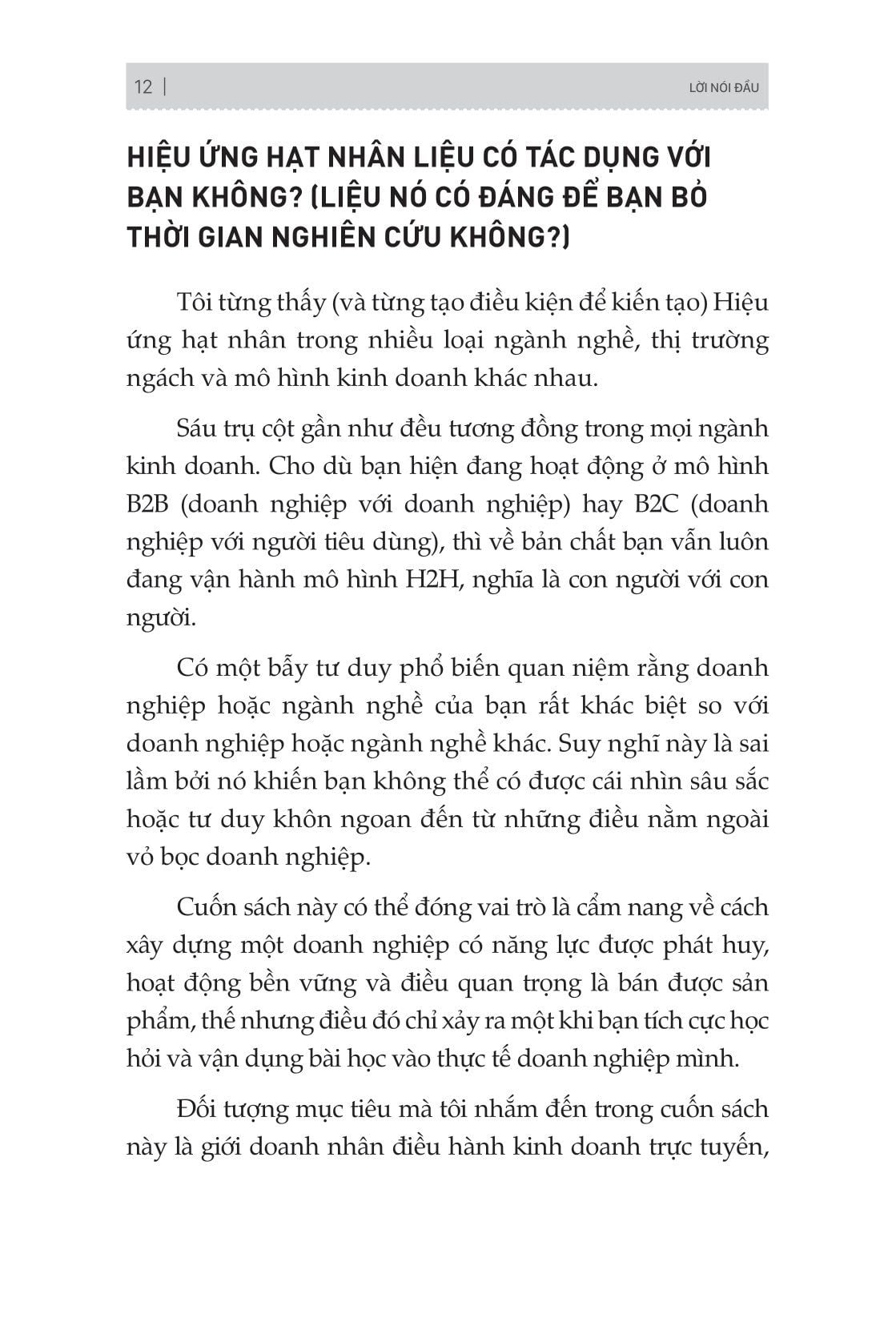 Vô vàn những câu hỏi mà bất cứ doanh nghiệp nào cũng phải đối mặt. Nếu bạn không thể trả lời đầy đủ và chính xác những câu hỏi trên thì cuốn sách Hiệu ứng hạt nhân là dành cho bạn. Cuốn sách sẽ cho bạn biết sáu trụ cột để tạo nên hiệu ứng hạt nhân giúp cho doanh nghiệp bạn bứt phá, đi sâu phân tích từng nội dung của sáu trụ cột kinh doanh để chỉ ra cách tối ưu từng trụ cột trong công ty bạn. Thông qua đó, bạn sẽ có một kế hoạch chi tiết để nâng cấp hệ thống điều hành doanh nghiệp, cho phép bạn kiếm lợi nhuận nhiều hơn và kinh doanh hiệu quả hơn.