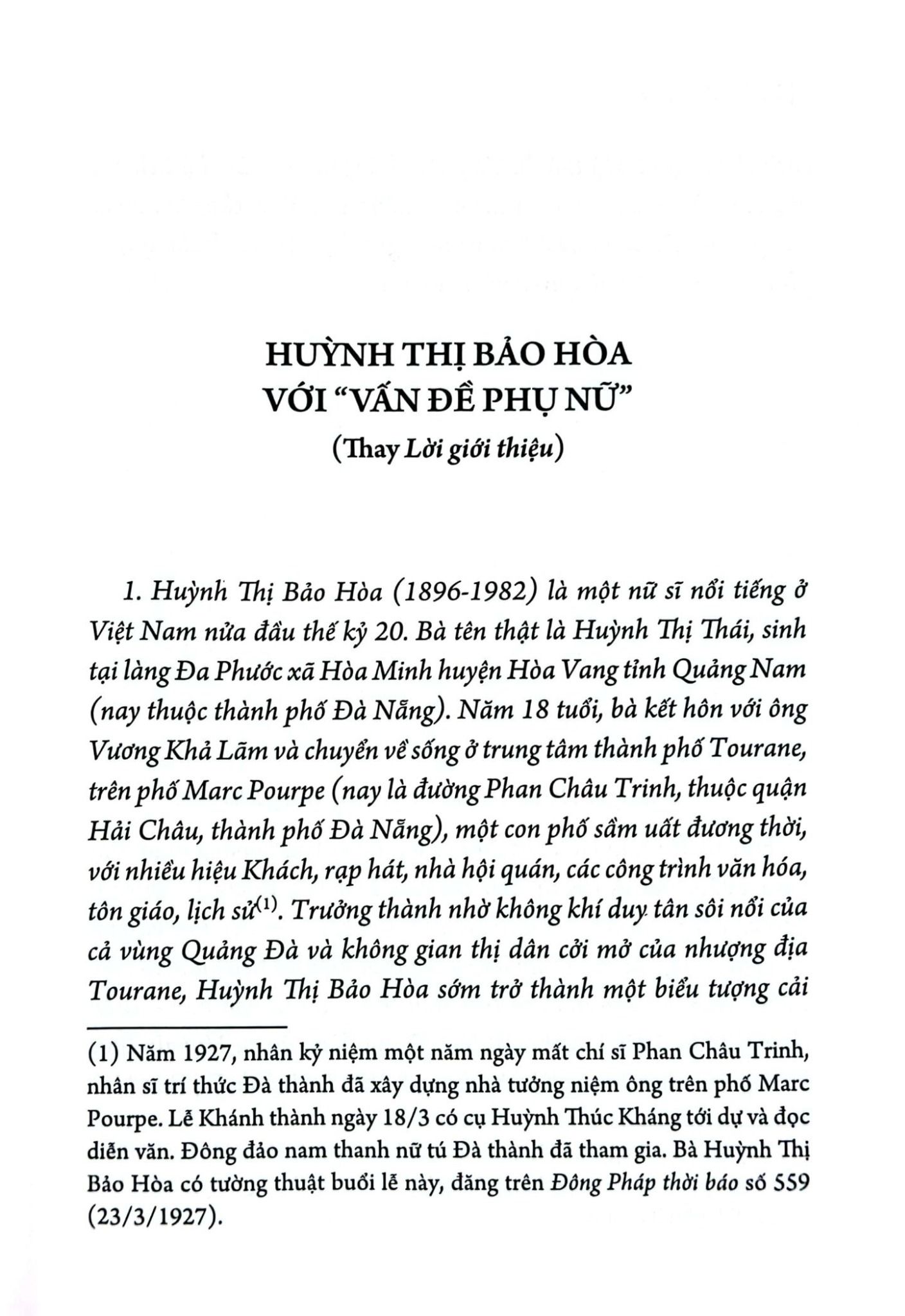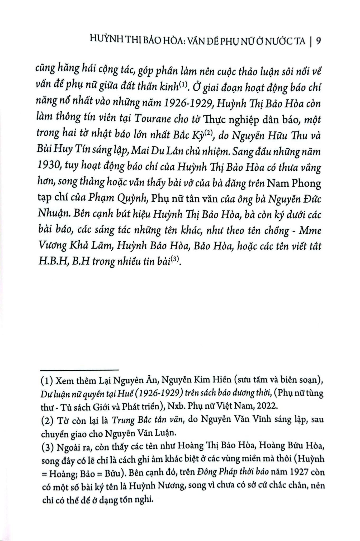 Cuốn sách tuyển chọn các bài báo, công trình, bài viết, sáng tác bàn về vấn đề phụ nữ của bà Huỳnh Thị Bảo Hòa, một trong những nữ sĩ nổi tiếng VN đầu thế kỷ XX, một biểu tượng của phụ nữ Quảng Nam Đà Nẵng thời Pháp thuộc về cải cách nữ quyền, đấu tranh vì quyền lợi phụ nữ trong xã hội. “Bà viết văn, làm báo, diễn thuyết, thành lập Đà thành Nữ công học hội, có mối quan hệ tương kính với các nữ sĩ khác trên khắp vùng Quảng Đà. Cùng với Đạm Phương, Phan Thị Bạch Vân, Huỳnh Thị Bảo Hòa được xem như lá cờ đầu của phong trào phụ nữ VN những năm 1920. Trưởng thành nhờ không khí duy tân sôi nổi của cả vùng Quảng Đà và không gian thị dân cởi mở của Đà Nẵng, Huỳnh Thị Bảo Hòa sớm trở thành một biểu tượng cải cách cho phụ nữ Đà thành. Từ giữa những năm 1920, bà tích cực viết văn, làm báo, tham gia các hoạt động xã hội, tổ chức hội đoàn cho phụ nữ Đà thành, hô hào và thúc giục họ đấu tranh cho quyền phụ nữ, nam nữ bình quyền và nữ quyền.” (Đoàn Ánh Dương). Những quan điểm của bà về nữ quyền gần gũi và thiết thực, chỉ rõ cho chị em phụ nữ đầu thế kỷ phương cách để trở nên người phụ nữ mới được quyền mưu cầu hạnh phúc đích thực, được tôn trọng và có đóng góp cho xã hội. Các luận điểm trong các bài báo của bà cho đến nay vẫn còn tính thời sự, chứ ko hẳn chỉ mang tính “khai sáng” cho chị em phụ nữ cách đây hơn 1 thế kỷ.