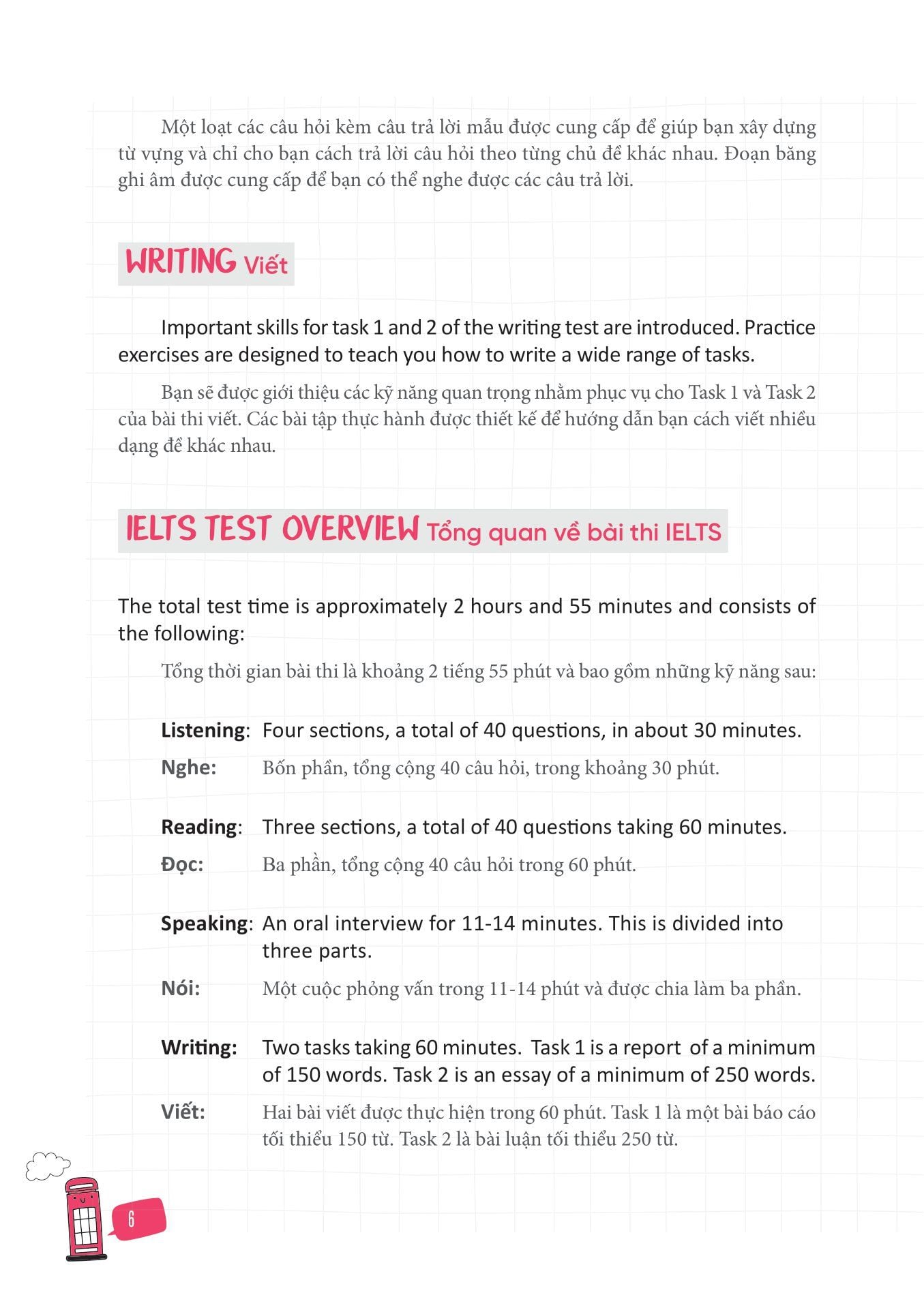 - Về phần thi viết: cuốn sách đưa ra cách làm cho tất cả các dạng bài xuất hiện trong 2 phần của đề thi viết.