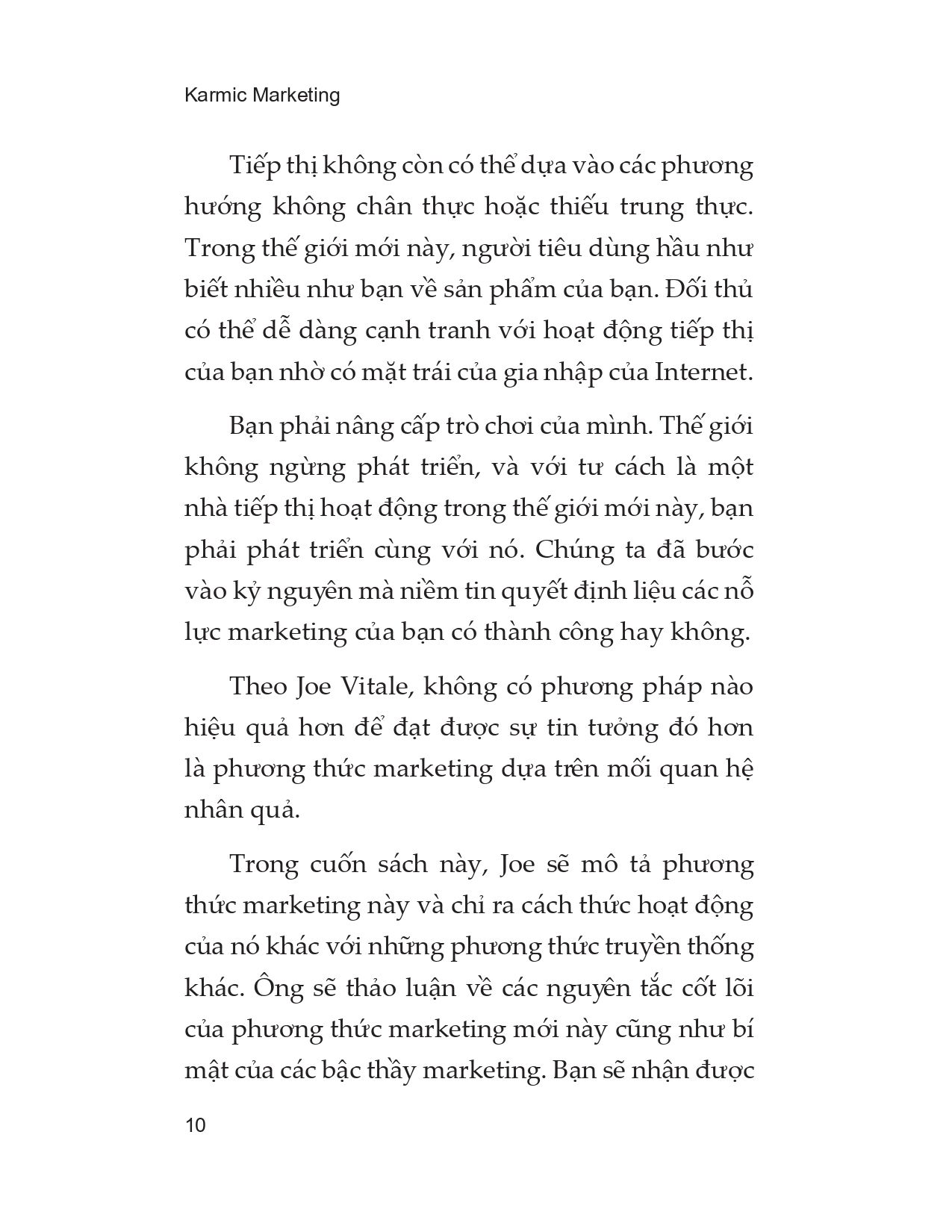 Bạn phải nâng cấp trò chơi của mình. Thế giới không ngừng phát triển, và với tư cách là một nhà tiếp thị hoạt động trong thế giới mới này, bạn phải phát triển cùng với nó. Chúng ta đã bước vào kỷ nguyên mà niềm tin quyết định liệu các nỗ lực marketing của bạn có thành công hay không. Theo Joe Vitale, không có cách nào hiệu quả hơn Karmic Marketing, phương pháp tiếp thị đã được thử nghiệm và chứng minh, lấy luật hấp dẫn làm nguyên tắc nền tảng.