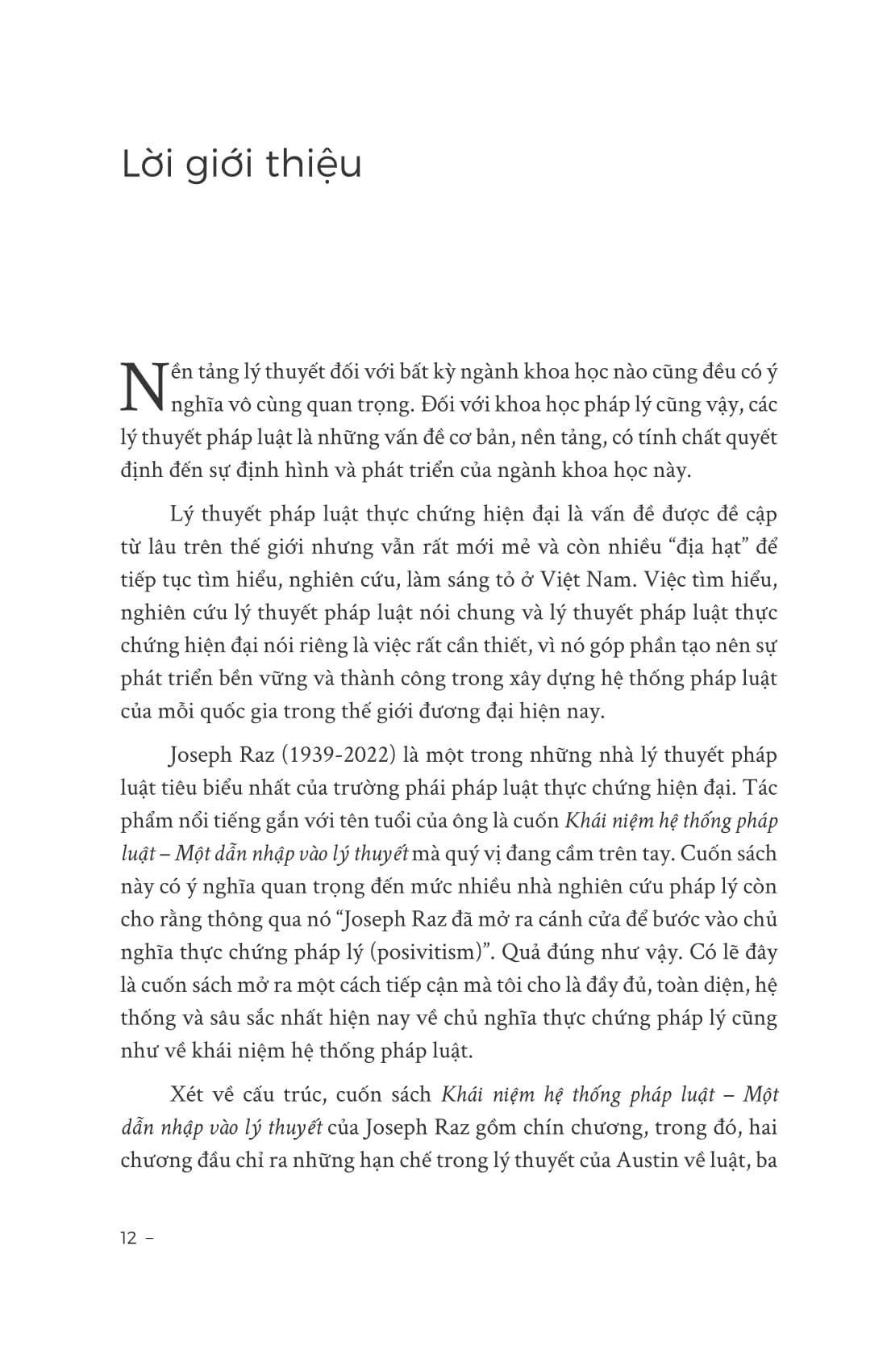 “Khái niệm hệ thống pháp luật – Một dẫn nhập vào lý thuyết” là tác phẩm chuyển soạn từ luận án tiến sĩ mà Joseph Raz đã thực hiện dưới sự hướng dẫn của H. L. A. Hart - vị triết gia thực chứng pháp lý vĩ đại của thế kỷ 20. Cuốn sách được xuất bản lần đầu vào năm 1970 và đây là bản dịch tiếng Việt đầu tiên của cuốn sách được thực hiện dựa trên phiên bản thứ hai của cuốn sách, được tái bản vào năm 1980. Đây có lẽ cũng là cuốn sách đầu tiên của trường phái thực chứng pháp lý được dịch và xuất bản tại Việt Nam. Cuốn sách cung cấp một khảo sát toàn diện, nhắm tới việc xây dựng lý thuyết về một hệ thống pháp luật cùng những khái niệm cơ bản có liên quan.