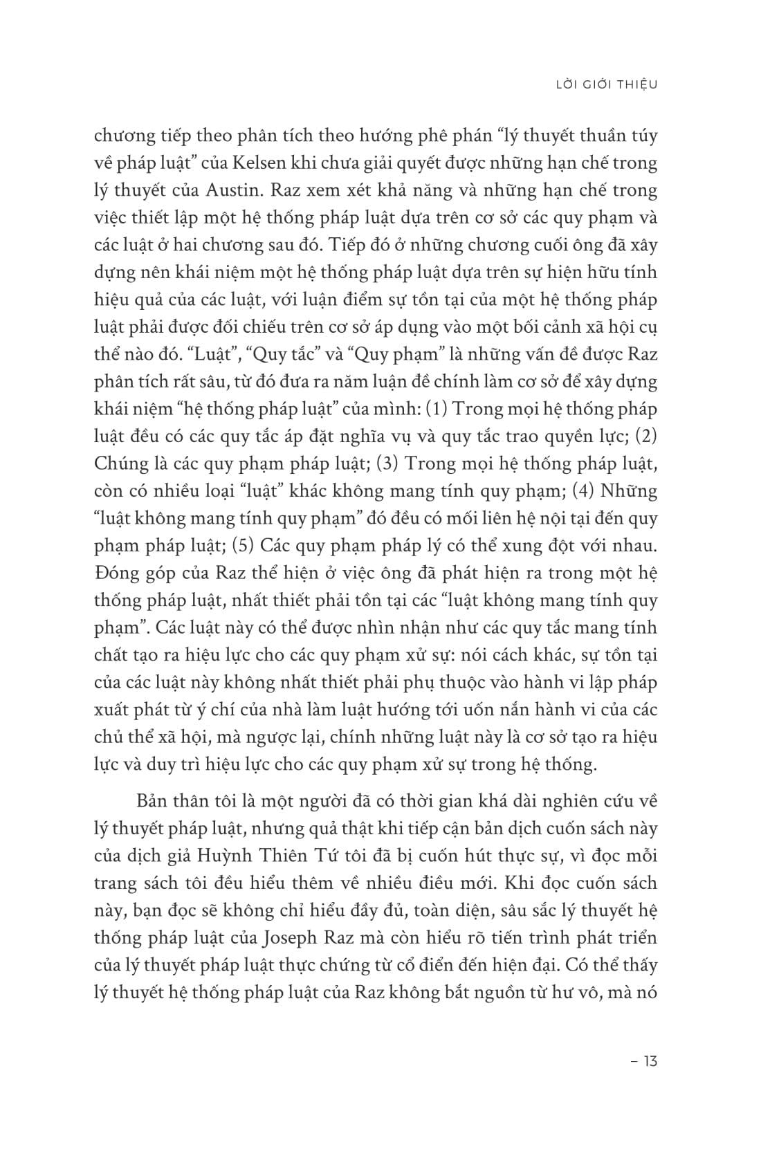 “Cuốn sách này có ý nghĩa quan trọng đến mức nhiều nhà nghiên cứu pháp lý còn cho rằng thông qua nó “Joseph Raz đã mở ra cánh cửa để bước vào chủ nghĩa thực chứng pháp lý (posivitism)”. Quả đúng như vậy. Có lẽ đây là cuốn sách mở ra một cách tiếp cận mà tôi cho là đầy đủ, toàn diện, hệ thống và sâu sắc nhất hiện nay về chủ nghĩa thực chứng pháp lý cũng như về khái niệm hệ thống pháp luật.”