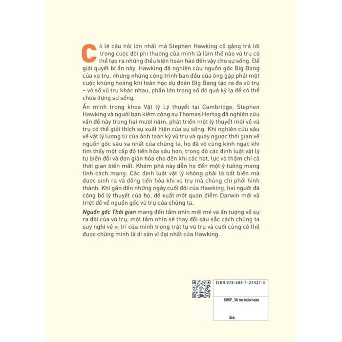 Ẩn mình trong khoa vật lý lý thuyết tại Cambridge, Stephen Hawking và người bạn kiêm cộng sự Thomas Hertog đã nghiên cứu vấn đề này trong hai mươi năm, phát triển một lý thuyết mới về vũ trụ có thể giải thích sự xuất hiện của sự sống. Khi nghiên cứu sâu về vật lý lượng tử của ảnh toàn ký vũ trụ và quay ngược thời gian về nguồn gốc sâu xa nhất của chúng ta, họ đã vô cùng kinh ngạc khi tìm thấy một cấp độ tiến hóa sâu hơn, trong đó các định luật vật lý tự biến đổi và đơn giản hóa cho đến khi các hạt, lực và thậm chí cả thời gian biến mất. Khám phá này dẫn họ đến một ý tưởng mang tính cách mạng: Các định luật vật lý không phải là bất biến mà được sinh ra và đồng tiến hóa khi vũ trụ mà chúng chi phối hình thành. Khi gần đến những ngày cuối đời của Hawking, hai người đã công bố lý thuyết của họ, đề xuất một quan điểm Darwin mới và triệt để về nguồn gốc vũ trụ của chúng ta.