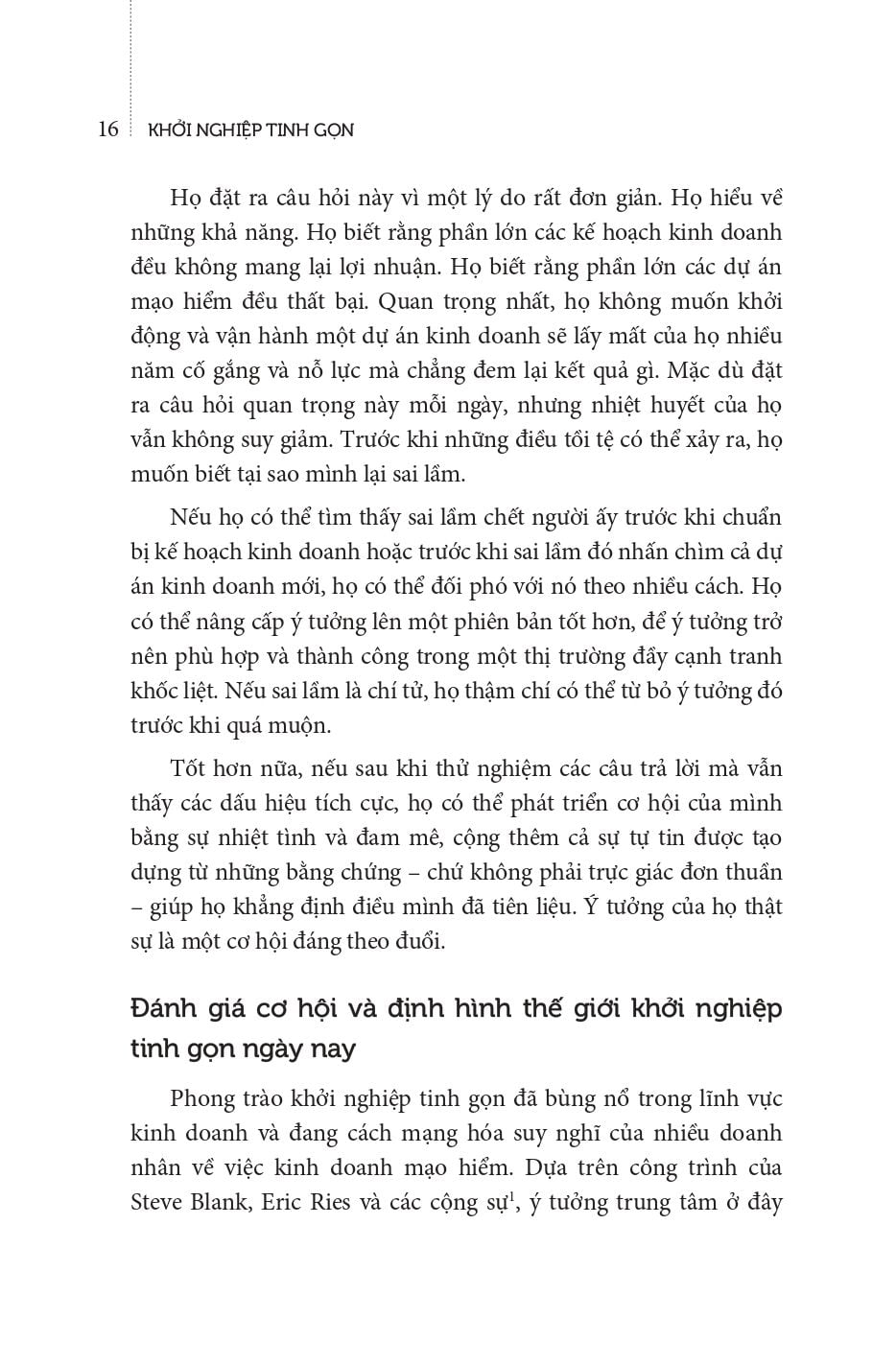 Thứ nhất, cuốn sách Khởi Nghiệp Tinh Gọn này giúp các doanh nhân và nhà đầu tư tránh được những rủi ro sắp đến. Quá trình chuẩn bị một nghiên cứu khả thi hướng vào khách hàng dựa trên 7 yếu tố trong cuốn sách này sẽ cho bạn cơ hội sớm rút khỏi dự án trước khi bước vào con đường có thể là ngõ cụt. Xác định được những sai sót nghiêm trọng từ sớm có thể tránh được việc lãng phí thời gian và công sức vào một cơ hội có thể là hoàn toàn sai lầm.