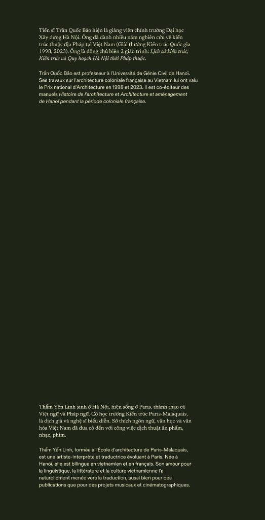 TRẦN QUỐC BẢO - Hiện là giảng viên chính trường Đại học Xây dựng Hà Nội. Ông đã dành nhiều năm để nghiên cứu kiến trúc thuộc địa Pháp tại Việt Nam. Ông là đồng chủ biên 2 giáo trình: Lịch sử Kiến trúc; Kiến trúc và Quy hoạch Hà Nội thời Pháp thuộc.