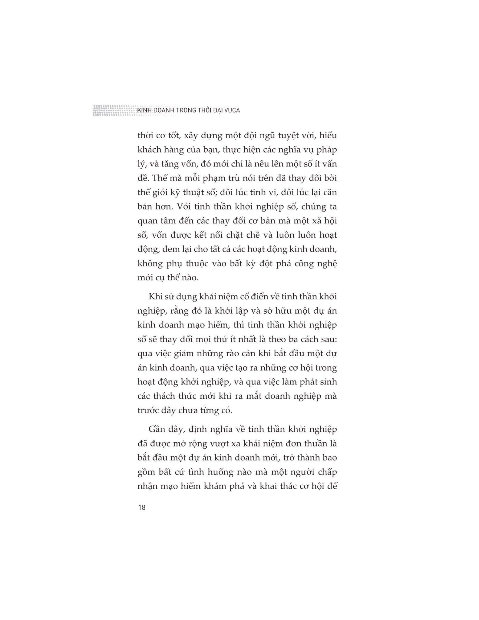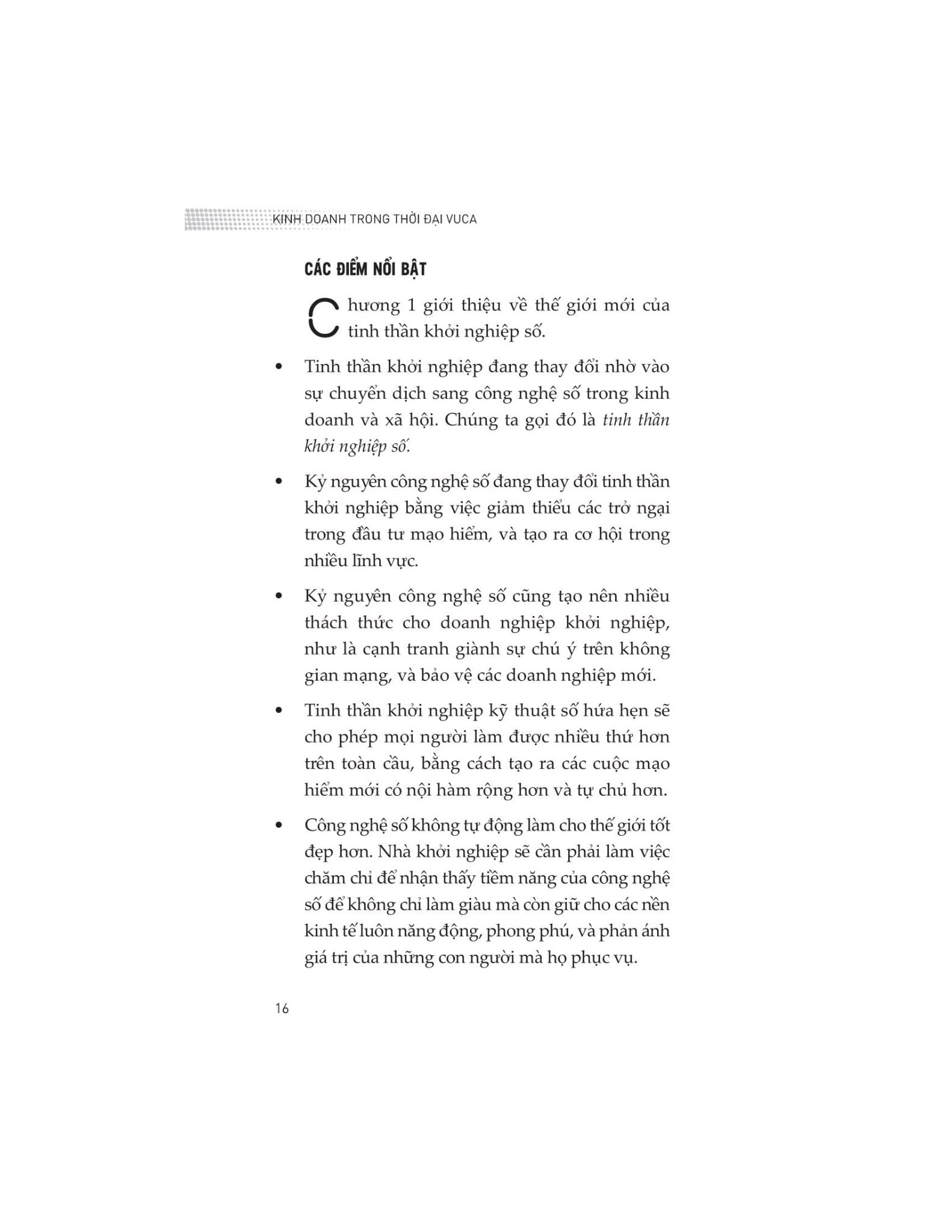 Kinh doanh trong thời đại VUCA – cuốn sách giới thiệu phiên bản giản lược của một quy trình tự làm chủ doanh nghiệp số: lên ý tưởng, xây dựng nguyên mẫu, thử nghiệm ý tưởng kinh doanh trên các khách hàng tiềm năng, và khai trương doanh nghiệp. Cuốn sách này sẽ chỉ cho bạn thấy: Bước đầu của việc tạo ra một doanh nghiệp số mới là nhận diện những cơ hội mới.