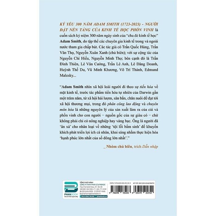 Kỷ yếu 300 năm Adam Smith (1723-2023) - Người đặt nền tảng của kinh tế học phồn vinh là cuốn sách được ra đời để kỷ niệm 300 năm ngày sinh của “cha đẻ” kinh tế học hiện đại Adam Smith (1723-2023), do Phanbook và NXB Đà Nẵng ấn hành. Đây là quyển sách đầu tiên về diện mạo và những đóng góp của ông cho lý thuyết kinh tế thế giới, do Trần Quốc Hùng - Trần Văn Thọ - Nguyễn Xuân Xanh chủ biên, với sự cộng tác, tham gia chấp bút của Nguyễn Chí Hiếu - Nguyễn Minh Thọ - Trần Lê Anh - Nguyễn Ngọc Anh - Nguyễn Tú Anh - Lê Văn Cường - Lê Đăng Doanh - Huỳnh Thế Du - Edmund Malesky - Emily Hamblin - Vũ Minh Khương - Hoàng Hải Vân…