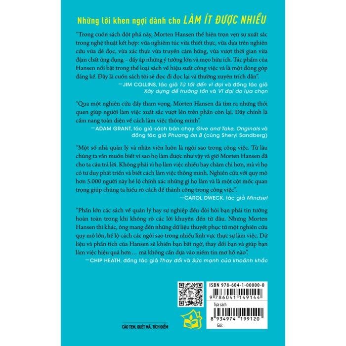 Mỗi chương sách đều cung cấp những câu hỏi gợi mở và nhận định quan trọng để bạn tự đánh giá hiệu suất cá nhân, nhận diện điểm mạnh và điểm yếu trong công việc. Sau khi hiểu rõ phong cách làm việc của mình, bạn sẽ được hướng dẫn qua các ví dụ thực tiễn, câu hỏi trắc nghiệm và các mẹo cụ thể để xây dựng chiến lược làm việc hiệu quả hơn. "Làm ít được nhiều" là một cuốn sách toàn diện, dễ tiếp cận và gần gũi, giúp bạn đạt được nhiều hơn bằng cách làm ít hơn – với nền tảng là những phân tích dữ liệu chưa từng có.