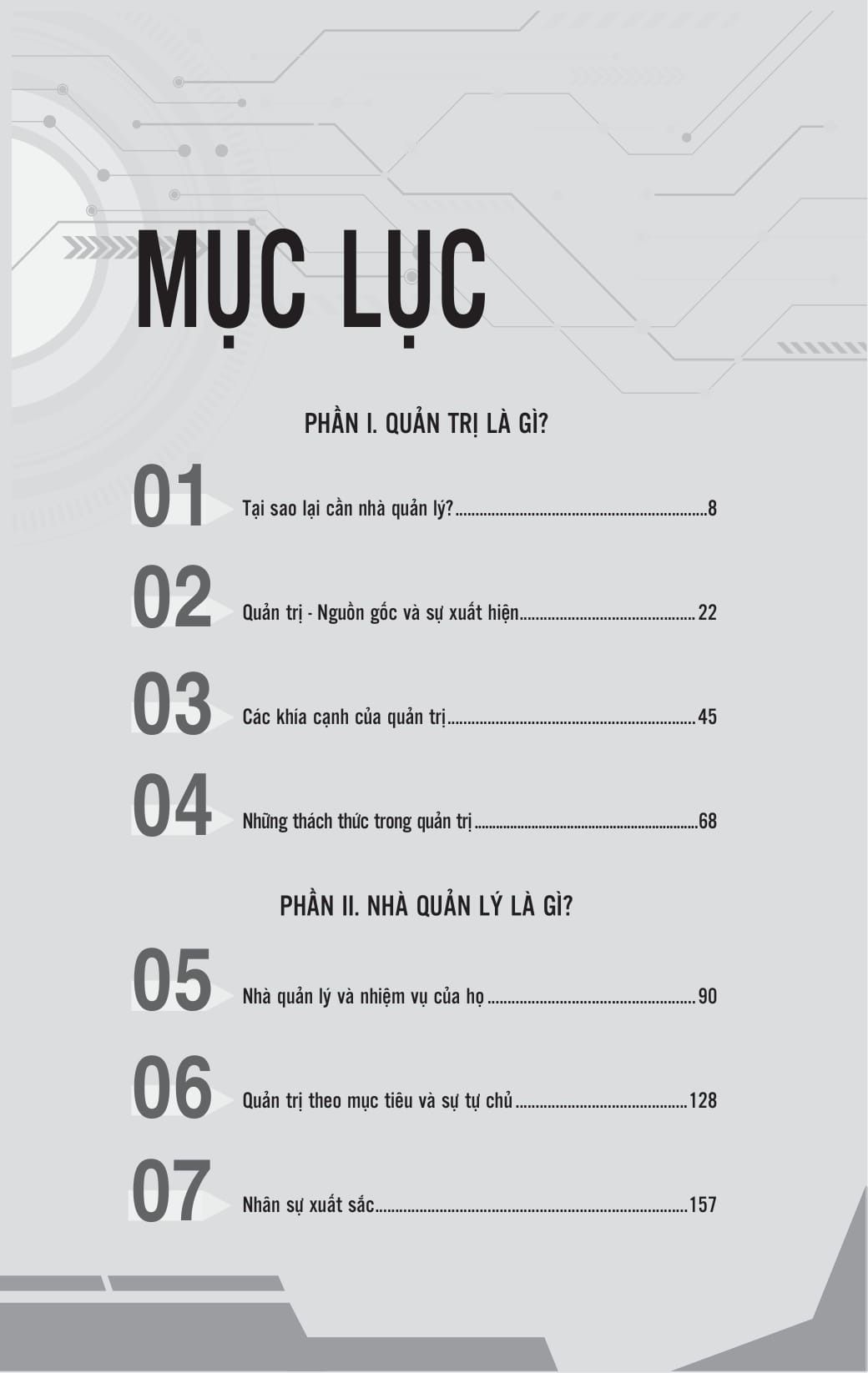Cấu trúc sách gồm sáu phần, bao quát toàn diện các khía cạnh của quản trị hiện đại: từ nguồn gốc và bản chất của quản lý, vai trò của nhà quản lý, hiệu suất doanh nghiệp, cho đến mối liên hệ giữa quản trị và đời sống xã hội. Qua từng chương, Drucker phân tích sâu sắc cách các tổ chức vận hành, lý giải sự chuyển dịch từ “công ty của cá nhân” sang “tổ chức có cấu trúc”, và khẳng định: quản trị không còn là đặc quyền của người chủ sở hữu, mà là một nghề chuyên nghiệp đòi hỏi tư duy hệ thống và trách nhiệm xã hội.